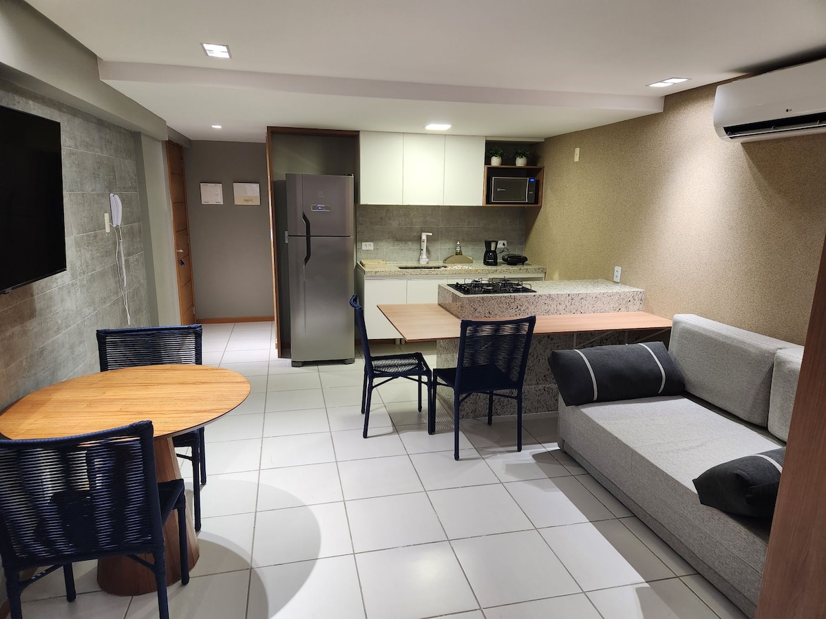 MagnMagnífico apartamento moderno e completo, com quarto de casal, sala com sofá, casa de banho e cozinha equipada com micro-ondas, cafeteira e secador de cabelo. Inclui lençóis e toalhas. A apenas 200 m do mar, perto do Caribessa, área nobre de João Pessoa. Condomínio com recepção 24h, piscina adulto/infantil com borda infinita e hidromassagem, vista para o mar, churrasqueira, academia, sala de jogos, espaço infantil, salão gourmet, lavanderia e estacionamento privado.