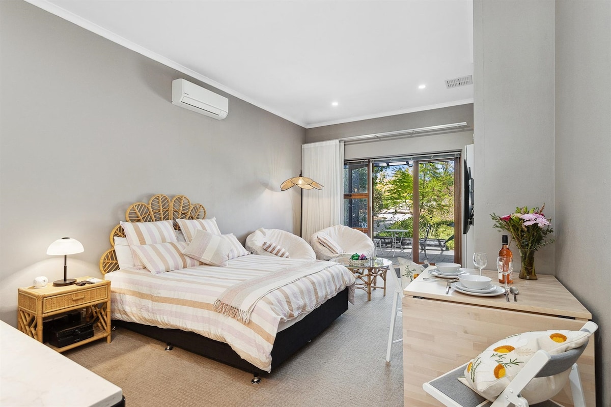 New funky Bali style villa. Beautiful indoor outdoor flow when opened up. Secure keypad card entry with undercover off street parking. Shared Swimming pool (heated - 3 season exc. winter) available on daytime hrs with waterfall feature. 2 Bedroom, TVs In all rooms with Netflix, Stan and Prime connected, Bluetooth wifi Stereo, Aircons to all rooms, indoor fireplace, small library New Addition ! Brand new Deluxe queen overflow room "Bedroom 3 - theroom" available as an extra charge
