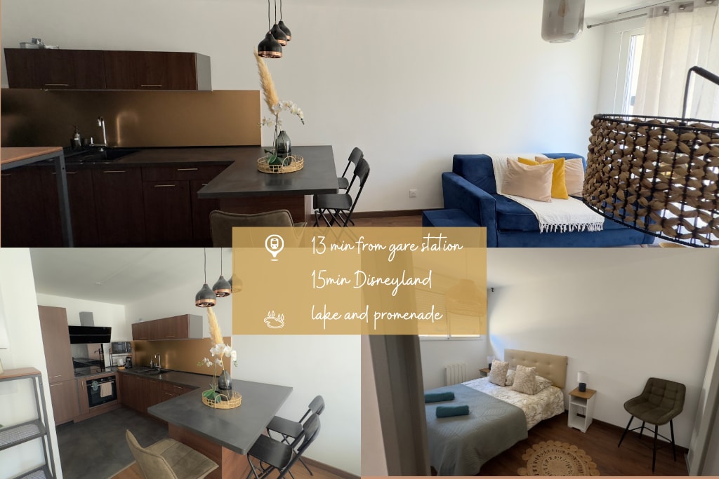 Շատ նորաձև կացարան ։ Շատ պայծառ կացարան, որը նախատեսված է մեկ կամ երկու հոգու համար ։ Հասանելի է ստորգետնյա կայանատեղի ։ Գտնվելու իդեալական վայր, տեղում տրանսպորտային միջոցի կարիք չկա ։ Մառնե - լա - Վալյե երկաթուղային կայարանին շատ մոտ, մուտք դեպի TGV կայարան ՝ Thalys և Eurostar և ուղիղ երթուղայիններ (Orly/CDG) 12 րոպե ոտքով: Ոտքով Դիսնեյ Փարք ՝ 12 րոպե ։ Առևտրի կենտրոն ՝ 2 րոպե ոտքով ։ Նկուղում առկա է կայանատեղի ։ E.774490002955J