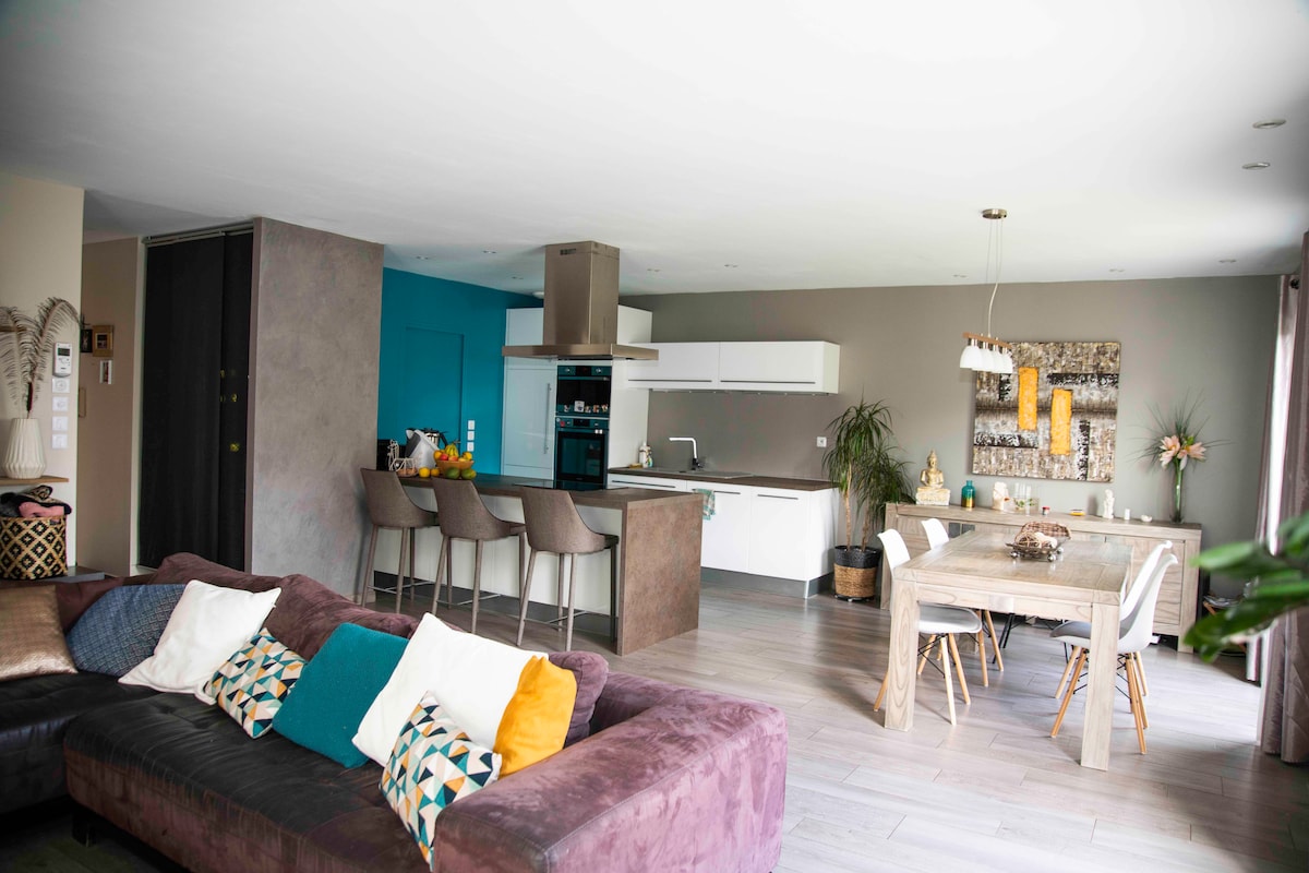 Ջերմ 100 քմ առանձնատուն երեք ննջասենյակով հյուրասենյակում, բաց հատակագծով խոհանոց 50 մ2 մակերեսով: Ամեն ինչ հասանելի է: Շատ լավ վայր է տրամվայից 5 րոպե քայլելու համար: Շրջագայությունները 1 կմ հեռավորության վրա են բոլոր հարմարություններին ։ Ես ապրում եմ այնտեղ իմ երեխաների հետ, այնպես որ ես այն վարձով եմ տալիս մնացած ժամանակ: Հնարավորություն է ավելացնել ներքնակներ առանց անհանգստանալու, եթե դուք ավելի շատ. Դուք ոչինչ բաց չեք թողնի, և եթե այո, ես այնտեղ կլինեմ ՝ ձեզ ուղղորդելու համար ։ Իդեալական է Լուարայի դղյակներ այցելելու համար ։