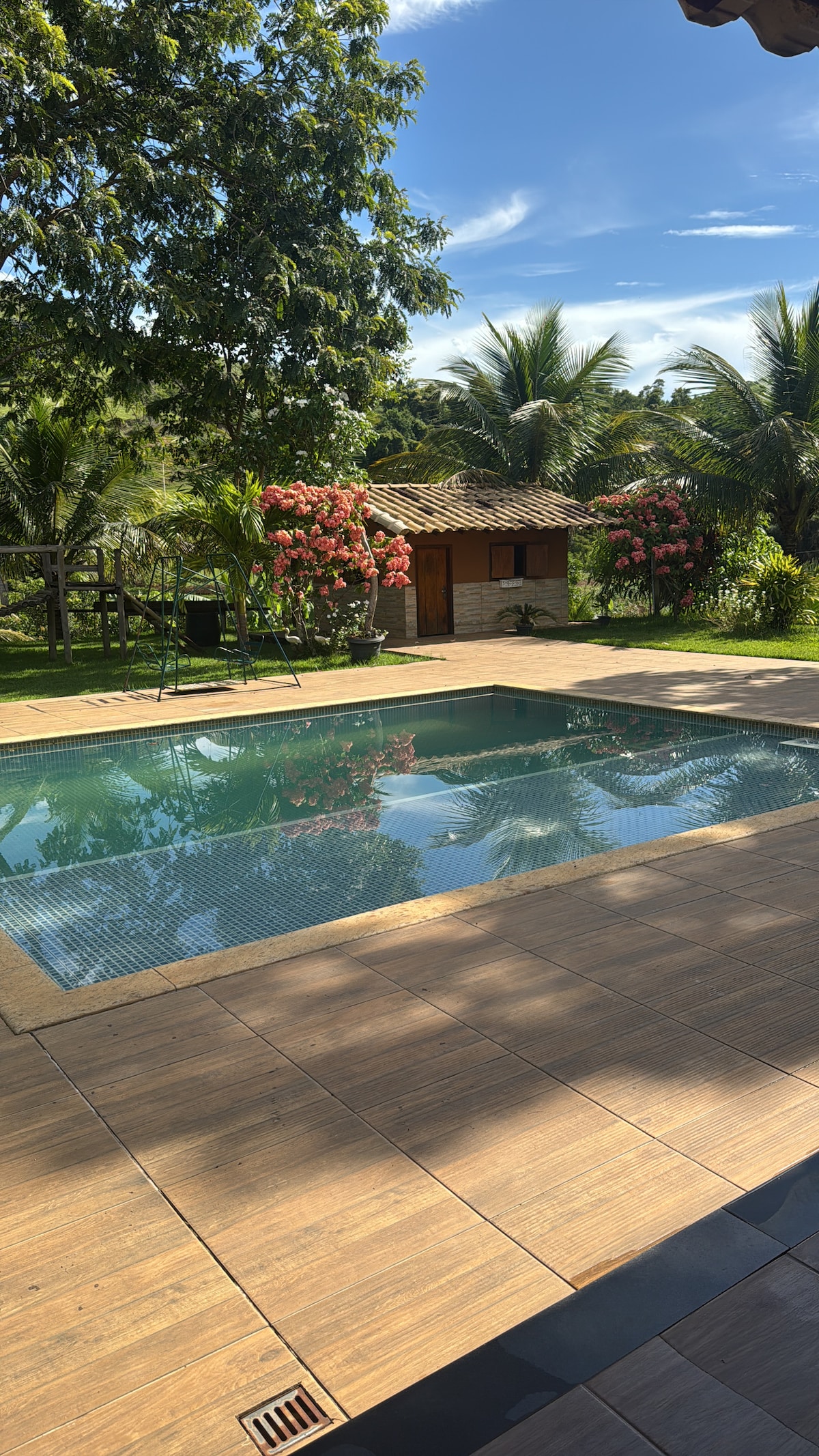 Um recanto tranquilo e acolhedor, onde o que prevalece é o canto dos pássaros. Todo o espaço é plano o que facilita a locomoção, além de ser seguro e reservado. A granja fica bem próxima ao comércio local. Uma casa ampla e bem equipada com piscina, espreguiçadeiras, açude, espaço gourmet, salão com sinuca, TV com SKY, Wi-Fi, açude, redes de balanço, pula pula e playground infantil. Você também tem a opção de desfrutar de uma relaxante Jacuzzi de hidro externa e uma sauna a seco.