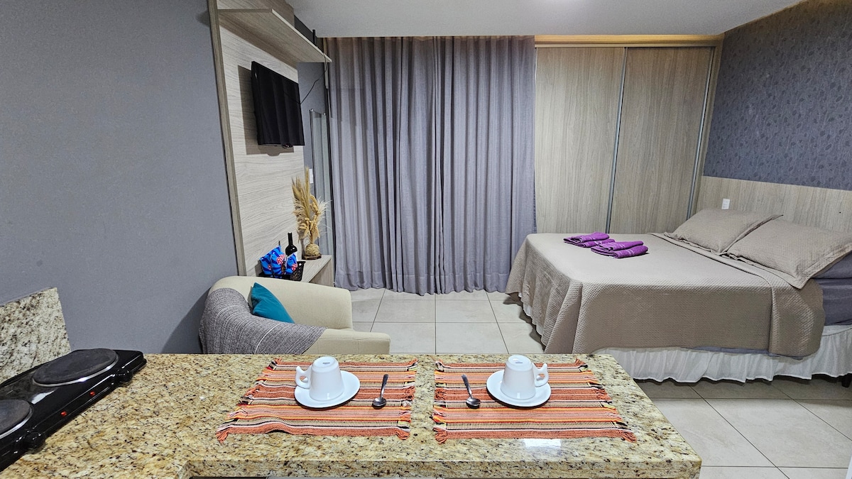 Feel the comfort and warmth of your home in the center of Juiz de Fora, with free parking included, whether for rest or work, with high speed internet (500mb). Your space here has a comfortable bed and a 400-thread-count duvet for cold nights watching your series on the 50-inch TV. If it's hot, we have air conditioning. The kitchen is equipped with pots and pans and ceramic dinnerware, in addition to all utensils. In the bathroom, enjoy the powerful shower with a double jet of water.