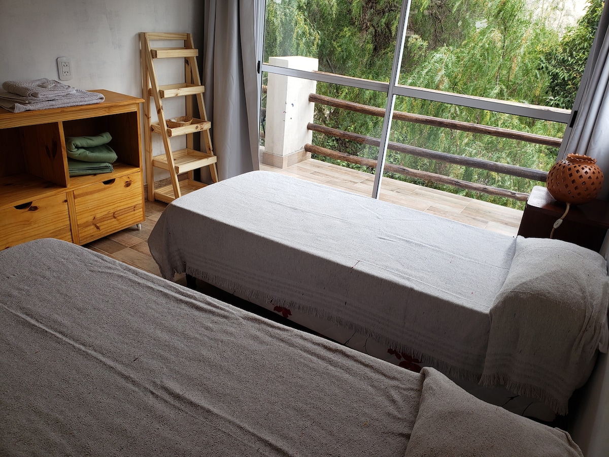 Ճանճ 2 հոգու համար 4000 քառակուսի մետր սեփականության տարածքում, Պալետա դել Պինտորի լեռների աներևակայելի տեսարանով, մշակաբույսերի դաշտի մեջտեղում, որը կառուցված է Անդյան ոճով, տեղական նյութերով, ինչպիսիք են adobe - ը, ձեռնափայտը և քարը, արևային ջեռուցումը և ջրի արդյունավետ օգտագործումը: