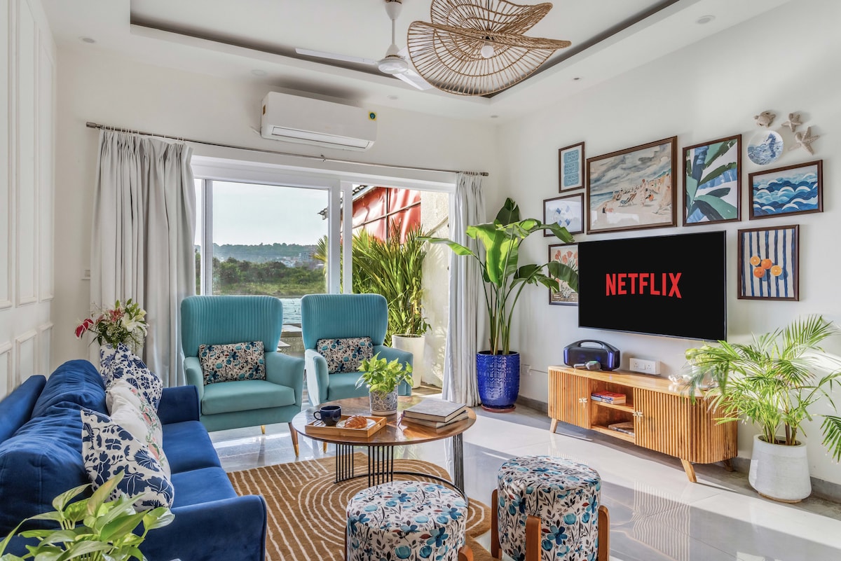 Vaayu, inspired by the 'Air Element', is a serene riverfront retreat along the Talpona River along with a Swimming Pool. This 2-bedroom apartment blends modern comforts with the charm of 1970s Goa. Unwind in the airy living room, enjoy river views from the entire house, and relax by the pool surrounded by coconut trees. With a well-equipped kitchen for homemade meals, this peaceful sanctuary offers the perfect getaway to experience Goa's timeless beauty, tranquility, and connection to nature.