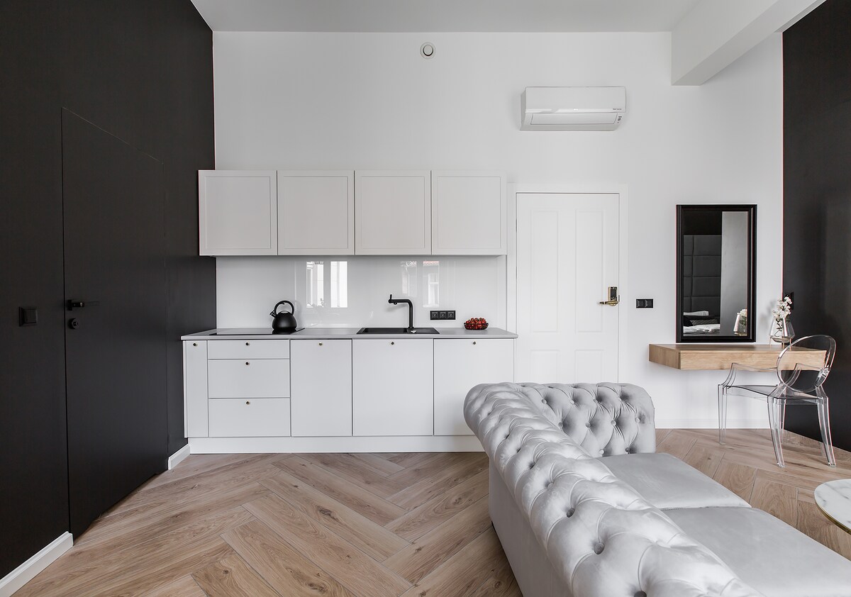 The apartment with a balcony will be perfect for a couple, 3 or 4 people. Consists: hall, a living room with a kitchenette and a dining area equipped with the necessary appliances, a bedroom and a bathroom with a shower and washing machine. In the living area you will find a comfortable sofa and flat-screen TV. The bedroom has a large and comfortable bed 160x200. The apartment has a Wi-Fi connection and a place for remote work. The apartment comes with a parking space in the underground garage.