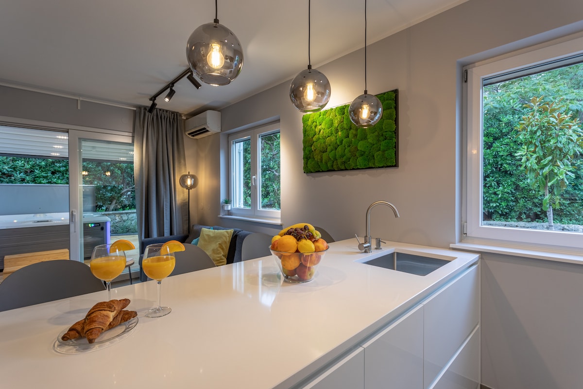 Հանգստացեք բնությամբ շրջապատված մասնավոր շքեղ վիլլայում, որը գտնվում է Ցրիկվենիցայի կենտրոնից ընդամենը 5 րոպե հեռավորության վրա։ Վայելեք ջեռուցվող լողավազան, բացօթյա ջակուզի, գինու անկյուն և խաղաղ այգի։ Կատարյալ է ընտանիքների կամ ընկերների համար, որոնք փնտրում են առանձնանալու հնարավորություն Ադրիատիկ ծովի ափին։ Վիլլան ունի 4 ննջասենյակ և հարմարավետորեն կարող է տեղավորել առավելագույնը 8 հյուրի։ Դրսում կա մասնավոր լողավազան, որը հնարավորություն է տալիս թարմանալ շոգ օրերին, և ըստ պահանջի կարող է ջեռուցվել՝ լրացուցիչ վճարի դիմաց։ Արևի շեզլոնգների գոտին օրվա մեծ մասն ստվերում է և գեղեցիկ տեսարաններ է բացվում։