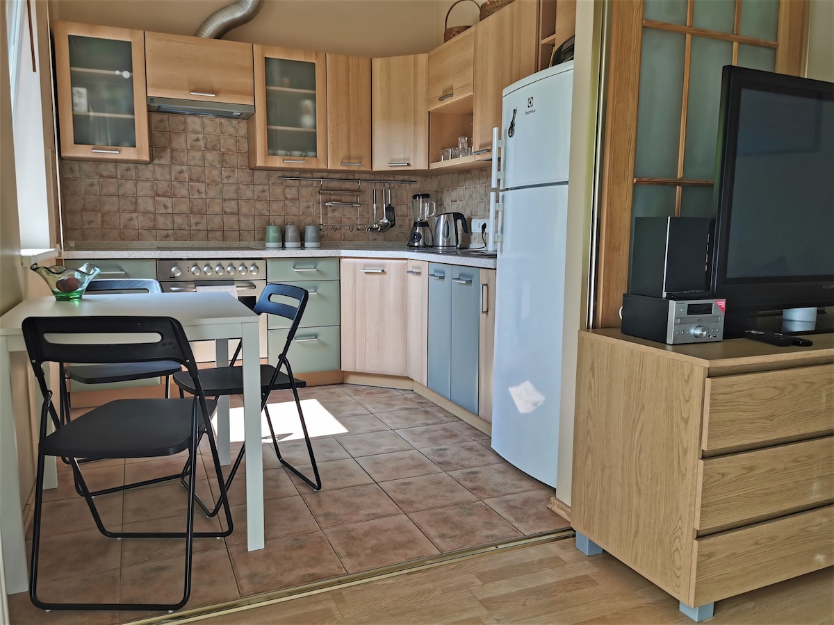Enjoy hassle-free beach days with our convenient free parking on the site and just 3 walking minutes away from the beach! Sauna house (separate building on the territory) for an additional fee. The apartment is situated in Jurmala within the free-entry zone, with free parking available on the premises. Our cozy apartment is located on the ground floor of a private house, boasting a separate entrance. It's an ideal retreat for two people, but can comfortably accommodate up to four guests.