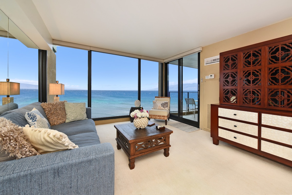 This serene beachfront retreat is located along the Kaanapali coast, less than 50' from the beach and waves. The unit offers a whole lot of Aloha, with unobstructed views of an expansive crystal blue-green ocean, crashing waves, swaying palm trees, adjacent islands, starry skies and sea life (sea turtles and monk seals all year long, migrating humpback whales from late Dec through April). The interior is clean, nicely appointed, & has lots of amenities to make your stay comfortable & enjoyable.