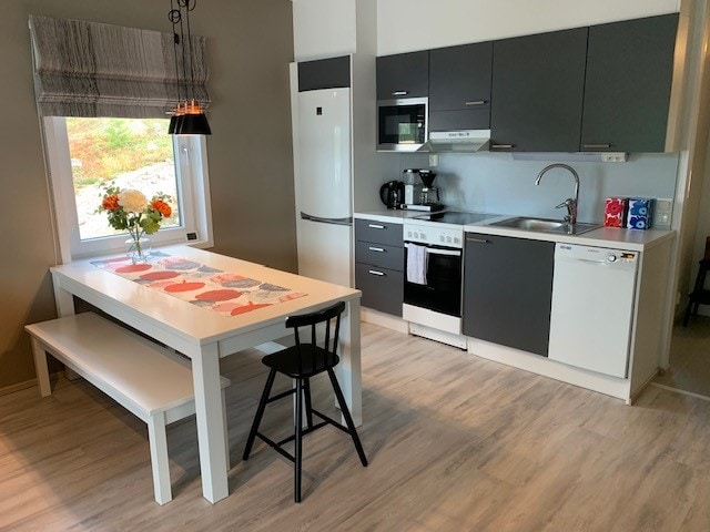 HILLSIDE PLUS 50m2 omalla saunalla Makuuhuone 1: Parivuode twin Makuuhuone 2: Kerrosvuode Olohuoneen sohva levitettävissä 1-2 lapselle Liinavaatteet ja pyyhkeet kuudelle. Maisemat vaarojen suuntaan. Avaimeton kulkujärjestelmä ja huoneistokohtainen langaton internet-yhteys. Sängyt ovat valmiiksi pedattu, pyyhkeet ja loppusiivous sisältyvät majoituksen hintaan.