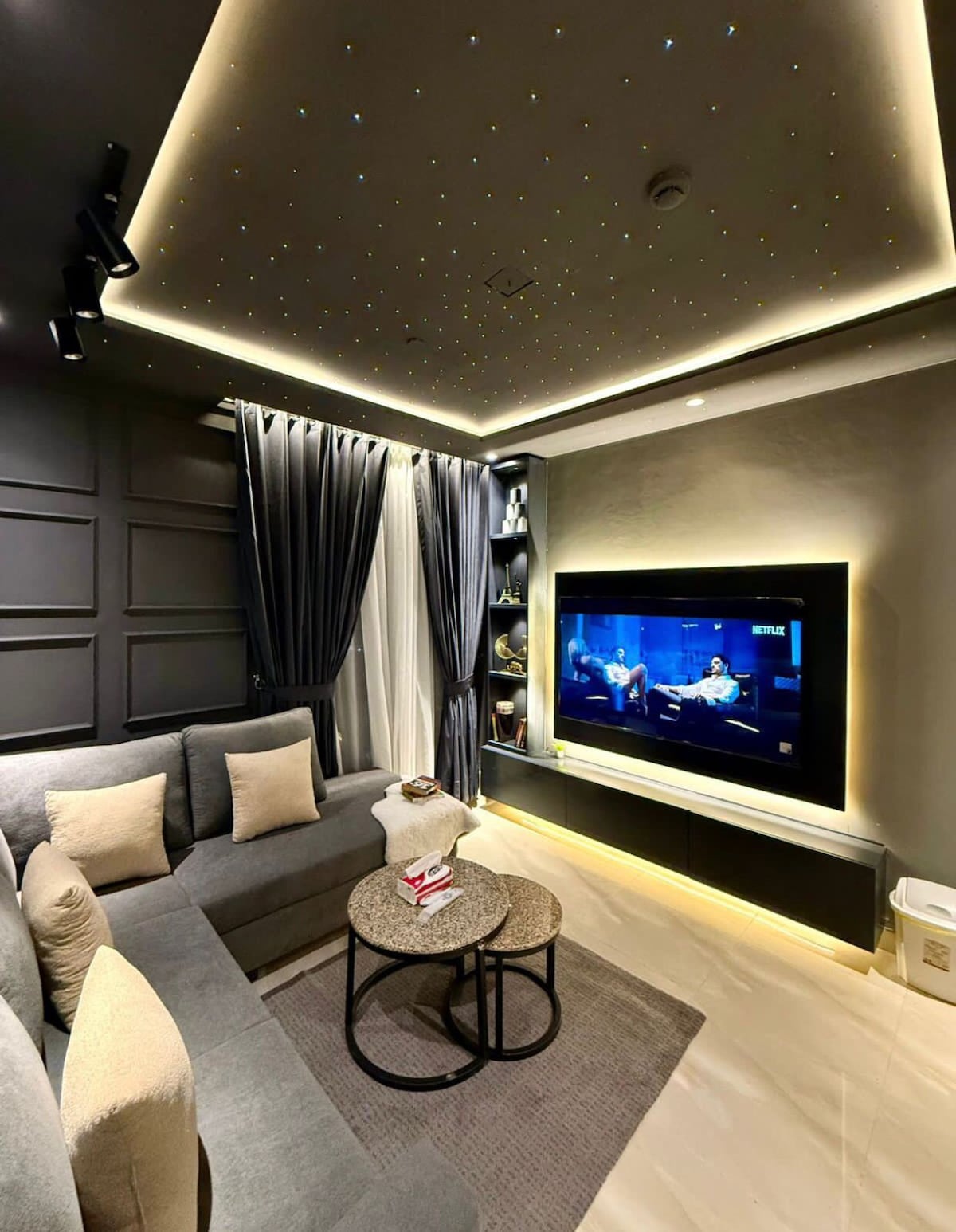 Experience refined living in this beautifully designed canal-view studio. The space features a plus king-size bed, a sleek frosted-glass bedroom partition, and a stylish lounge with a velvet sofa set and a 42” LED, Bose HT, entertainment setup.Soft, warm lighting creates a calm, hotel-style atmosphere, making it perfect for relaxing after a long day. Ideal for romantic getaways, business trips, or anyone who appreciates comfort with a touch of luxury.5-10 min away from airport and from gulberg .