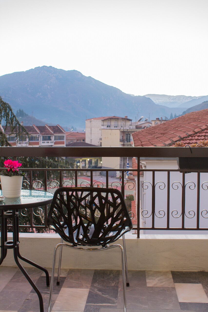 This bright 2-bed apartment is perfect to relax in, nestled in the roots of Meteora rocks. Enjoy the breathtaking view of Meteora and Kalampaka from its spacious balcony where you can also watch the magical sunset. Located in a quiet area in Kalampaka's Old Town with its beautiful architecture, 10 minutes walk from the city centre. Tips: It's perfect for hikers too, as it sits just next to the famous Footpath of Holy Trinity and just 15 min walk from the Natural History Museum :)