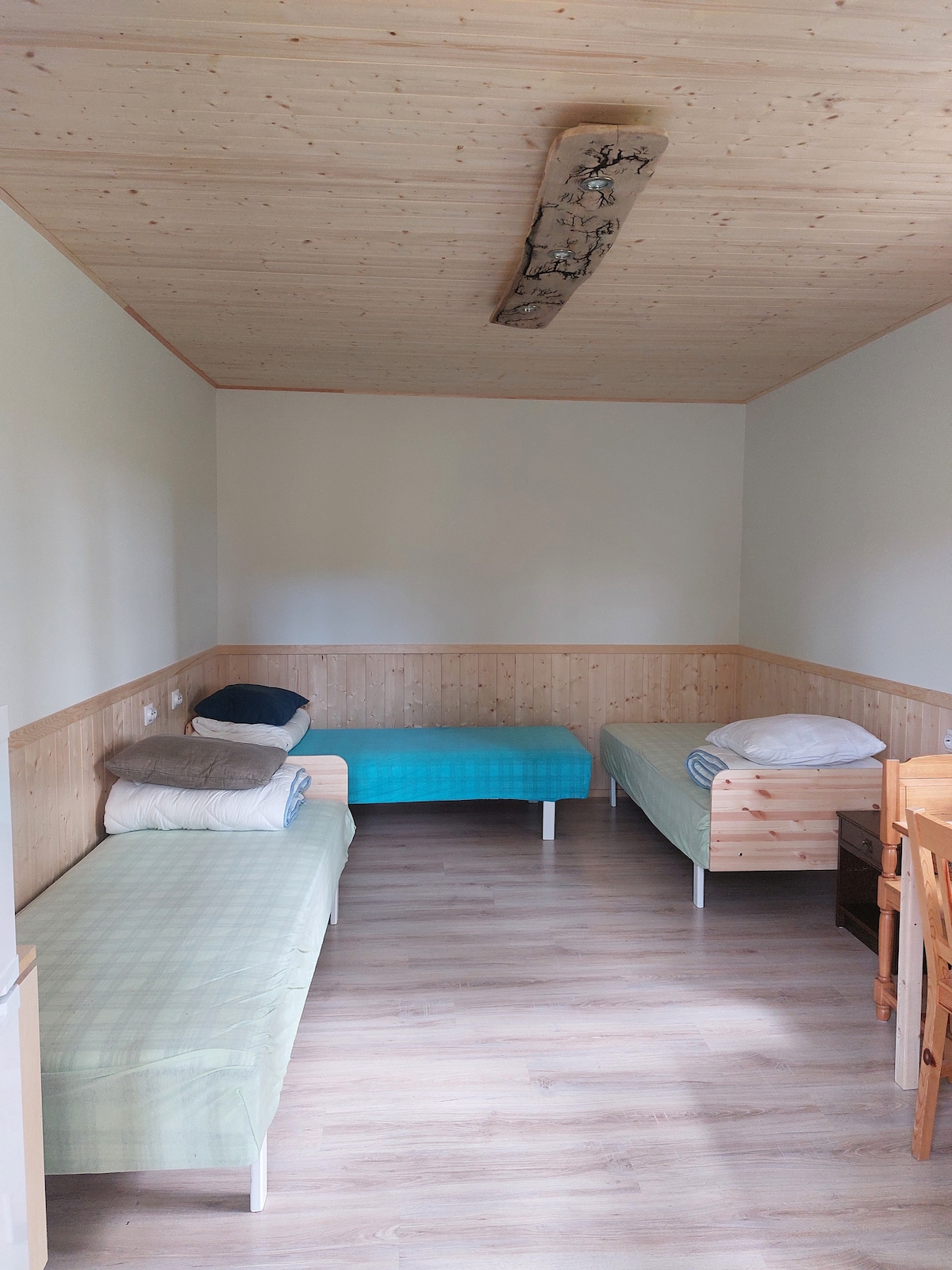Our sauna house includes fully-equipped kitchen, a living room with a large folding sofa, a toilet, a bathroom, and sauna. Upstairs, you'll find a cozy queen bed accompanied by a crib for your little one. Additionally, two relaxation spots crafted with netting offer the perfect place for relaxation. Next to the sauna house awaits a hot tub, a grilling area and a cozy camping spot with two beds. In the garden, a greenhouse awaits, provides vegetables during the summer months.