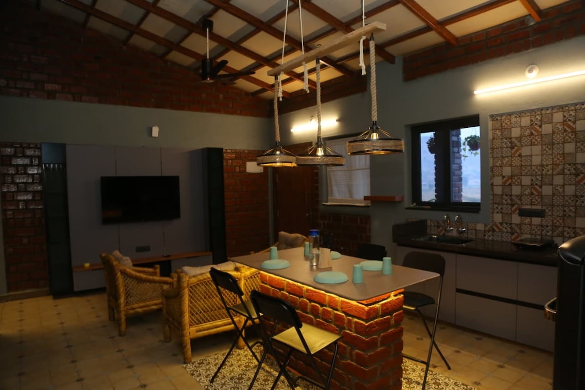 Welcome to your serene getaway located in North of hampi, nestled alongside a picturesque paddy field with breathtaking mountain views. Our modern independent 2 BHK home (fully air-conditioned) offers the perfect blend of comfort and nature, making it an ideal retreat for groups and families seeking a peaceful escape. Complimentary breakfast is included, and our fully equipped kitchen—featuring an oven, fridge, and stove—is perfect for preparing meals during your stay.