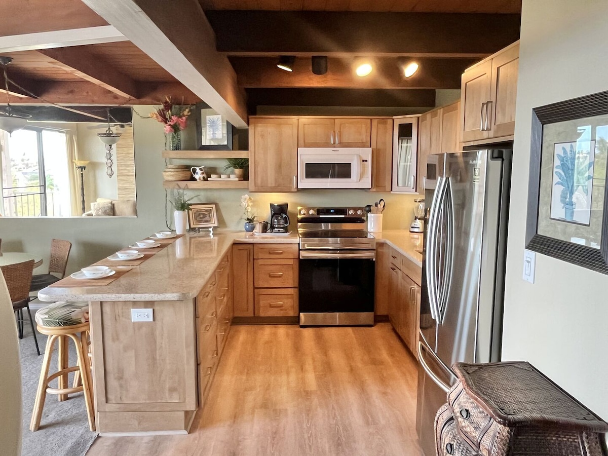SPECTACULAR OCEAN AND SUNSET VIEWS, including outer islands from the living room and lanai. You'll enjoy drinks in the evening watching the incredible sunsets. The condo has been totally redecorated and upgraded. The kitchen and bathroom have maple cabinets and elegant granite counter tops. There is a comfortable king size bed, a well-stocked kitchen, central AC, with all new bamboo floors throughout, and a new washer / dryer. The Condo is owned and maintained by Maui residents.