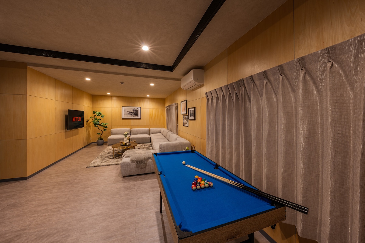 The expansive living area features large windows showcasing stunning mountain views, while the open-plan kitchen and dining space make entertaining effortless. After a day on the slopes or exploring the countryside, unwind in your private sauna or indulge in the traditional Japanese-style bath (Ofuro) for the ultimate relaxation.