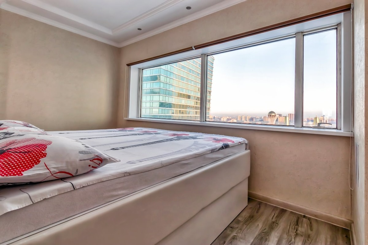 Առաջարկում եմ մնալ մայրաքաղաքի սրտում գտնվող գեղեցիկ բնակարանում ։ Դուք ցնցող տեսարան կունենաք դեպի Աստանայի կենտրոն ։ Մոտակայքում կան քաղաքի, բիզնես կենտրոնի, առևտրի կենտրոնների որոշ տեսարժան վայրեր ։