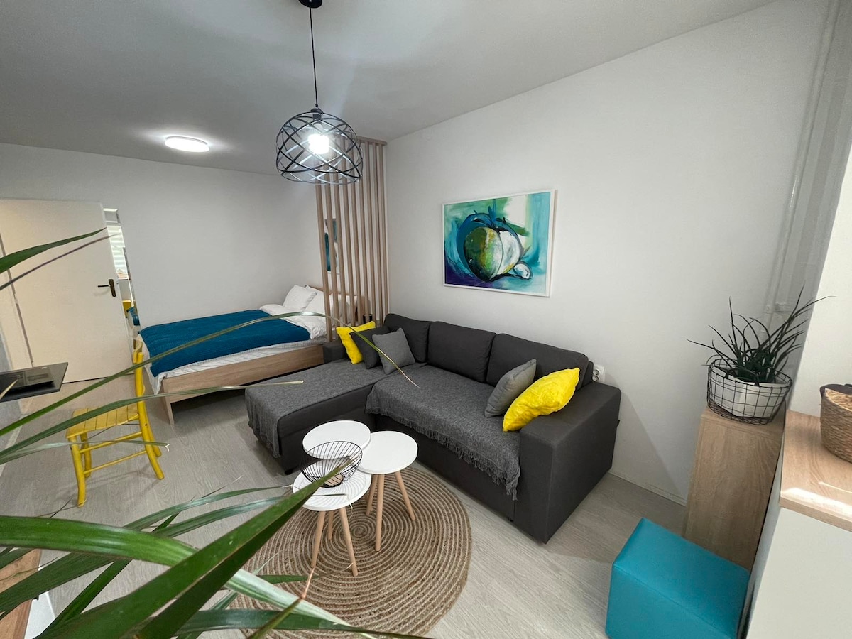 New apartment in the central area of Skopje. In beautiful and peaceful neighbourhood near to all main attractions! One bedroom apartment of 45m2 designed for comfort and relaxation. Offering a cozy bedroom and modern living space. With Free Private Parking and 20-minutes walking distance from the city centre (main square). For your convenience, everything is right at your doorstep – a restaurant, coffee shop, pharmacy, beauty salon, while a shopping mall is just a 5-minute walk away.