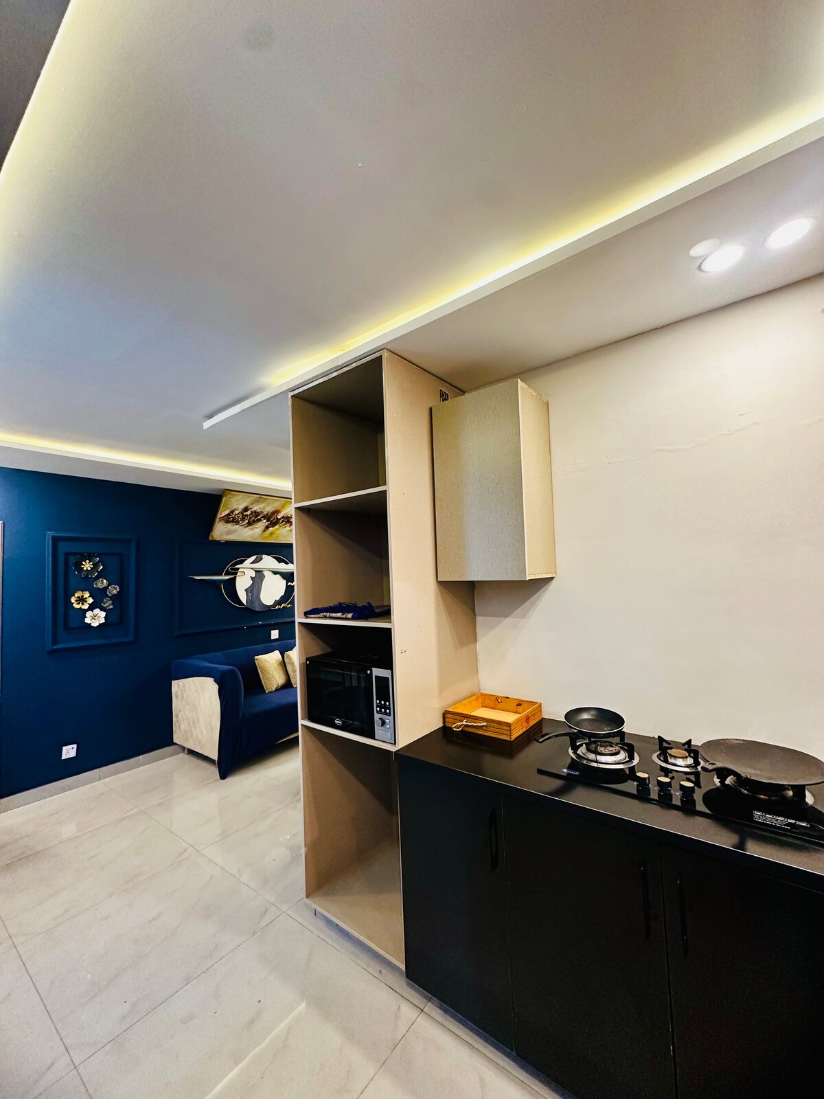 Welcome to The Aura Stays — home, but better. Modern, cozy studio apartment with a king bed, leather couch, smart TV with Netflix, and fast Wi-Fi. Enjoy a stunning window view, soft lighting, and elegant decor. Includes a compact kitchenette with kettle, and a clean, modern bathroom. Located in a secure building in the heart of Bahria Town — close to cafes, parks, and landmarks. Perfect for solo travelers, couples or business stays. Book now for comfort, style, and peace.