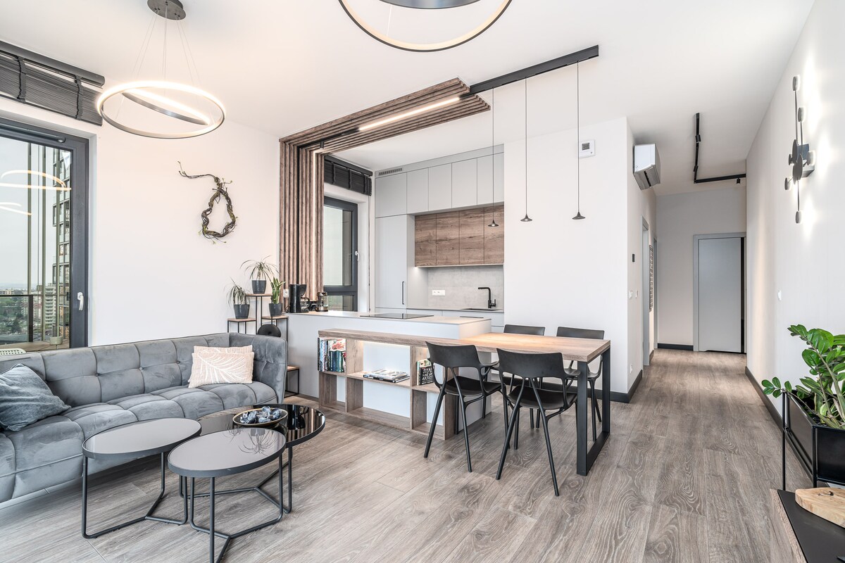 Արևոտ, հարմարավետ բնակարան Առաջին թաղամասում ։ 10 - րդ հարկի շքեղ տեսարան ։ Ավելի քան 100 մ2 տարածք (ներառյալ 20 մ տեռասները )՝ 2 առանձին փակվող ննջասենյակ ՝ քնելու և աշխատելու համար, ինչպես նաև ևս 2 ննջասենյակ հյուրասենյակում ։ Կատարյալ է միայնակների, զույգերի և բիզնես ուղևորների համար ՝ ընտանիքով կամ առանց նրանց ։ Գերազանց վայր է Spodek - ի, NOSPR - ի և Կոնգրեսի կենտրոնի մոտակայքում ։ Շենքում կա հարմարավետ խանութ, բարբարոս, թաիլանդական մերսման սրահ, Կամեկիի գինու համ ։