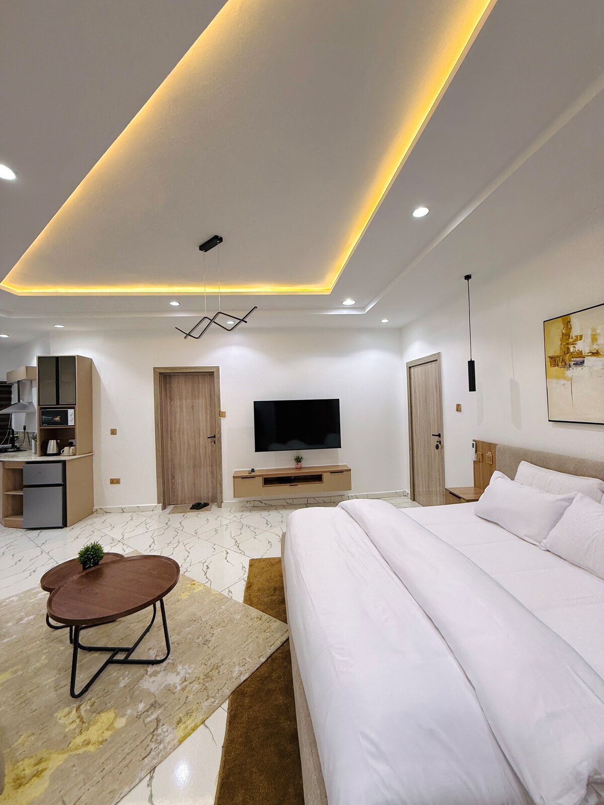 Contemporary, Classy, Spacious and Functional. The Studio unit runs fully on a solar powered inverter, standby generator in addition to a relatively stable electricity supply. Equipped with a smart TV, smart door, air conditioning unit, water heater and a fully equipped open plan kitchen. A cozy place for your getaway stay. Facility has full access to a functional gym, a swimming pool, play area replete with a snooker table, table tennis and a game corner in the pavilion.