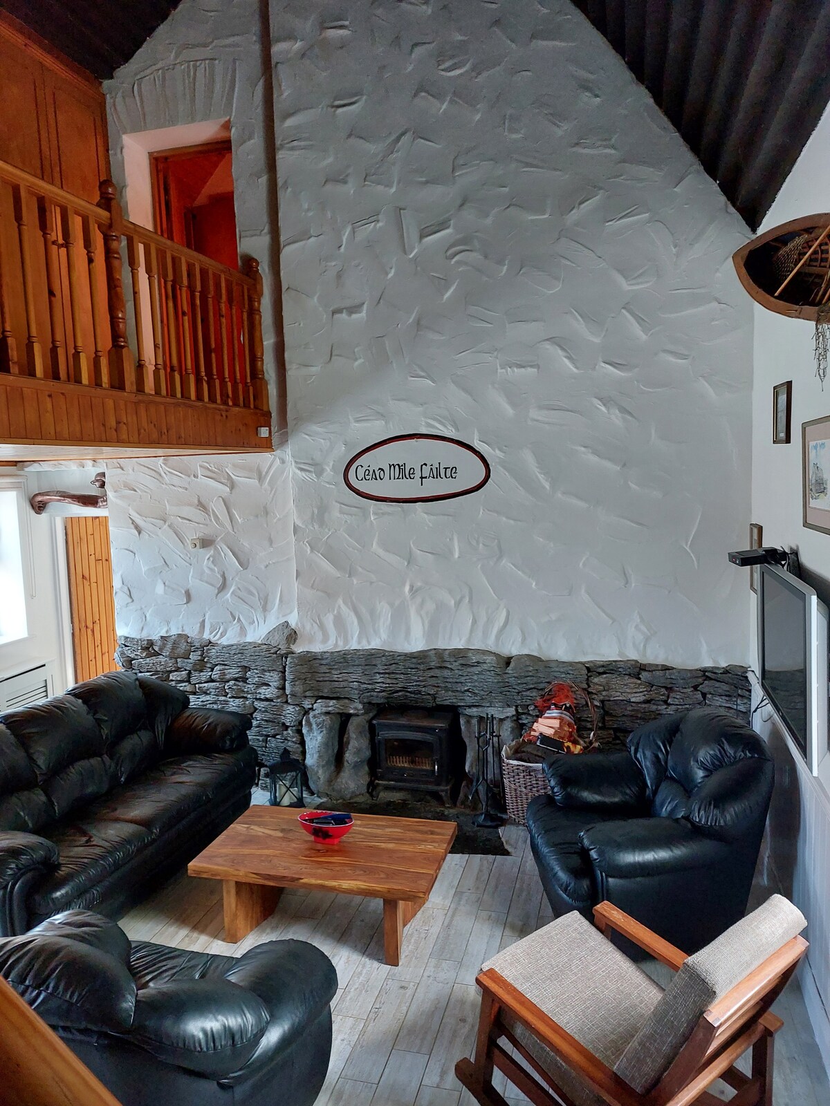Unique home constructed entirely from stone. Two wood-panelled upstairs bedrooms and one downstairs bedroom. All bedrooms en suite. Large modern well-equipped kitchen. High ceiling living area. A real turf stove to warm yourself. Great for adults and for children. (Cots high chairs etc. available) Lots of space, car-parking. Surrounded by beautiful Connemara scenery. Rural setting yet only 5 miles from Galway city centre.