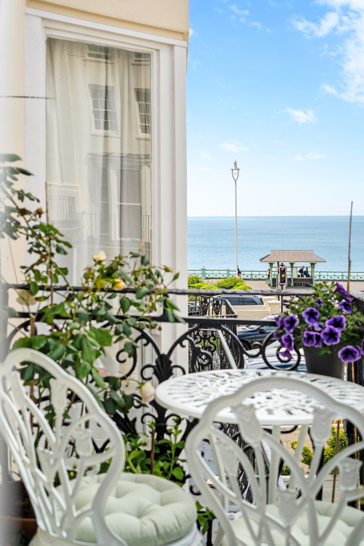 Enjoy an amazing stay in our gorgeous, centrally-located, first floor, balcony flat, set in a converted Regency building in Brighton's trendy Kemptown. Light floods in through 3 full length windows, which look out to sea. The flat has an accessible balcony; is full of original features: high ceilings with decorative plasterwork, fireplace & the original wooden shutters; as well as GCH, open plan, well equipped, kitchen, smart TV, newly fitted walk-in shower (no bath) & a cosy double bedroom.