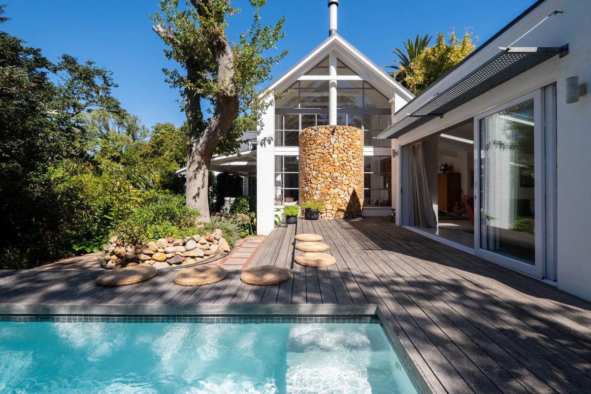 Ծովափնյա լեռնային հանգիստ բացառիկ միստիկ ժայռերի արգելավայրում ՝ անծայրածիր տեսարաններով, լողավազանով և մեծ ֆիբոս պարտեզով ՝ դեպի լողափ տանող մասնավոր ճանապարհով ։ Այս ճարտարապետի նախագծած փայտե բունգալոն կատարյալ է Քեյփթաունն ու Հարավային թերակղզին ուսումնասիրելու կամ պարզապես արգելելու և հանգստանալու համար ՝ պահպանական գյուղի վճիտ ընկղմման մեջ ։ 2 մեծ en - Suite ննջասենյակ, ինչպես նաև հարմարավետ լոֆթ և լրացուցիչ երկհարկանի մահճակալներ երեխաների համար: Տունը գտնվում է Քեյփթաունի կենտրոնից ընդամենը 45 րոպե հեռավորության վրա ։