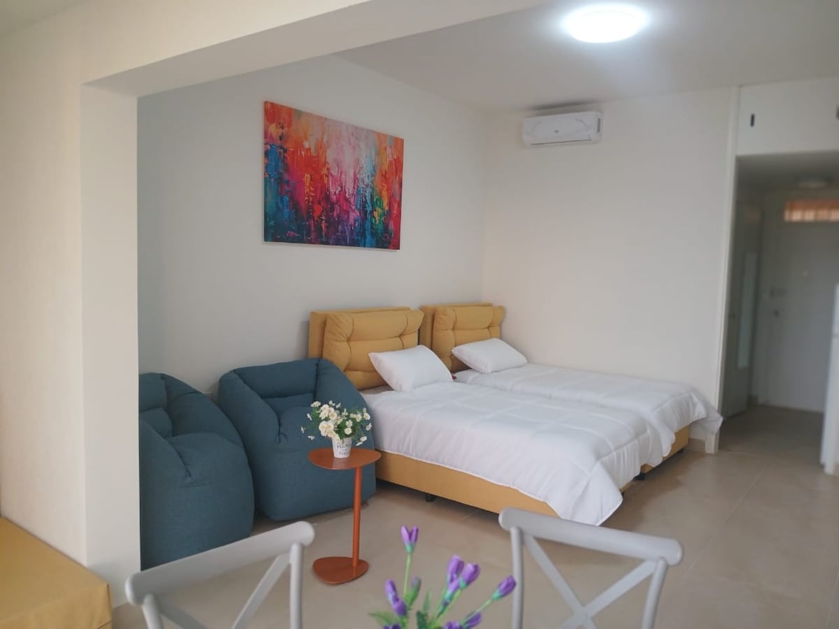 This beautiful 35sqm chalet,4th floor, renovated&furnished.Benefits of 2 single beds,1largeWC,2closets,AC,smartTV,1parking,24hr electricity&security.A cozy stay with stunning view of garden palms,sea.Perfect for a retreat&a relaxing gateway.The thoughtful layout&calming palette of this chalet is spacious enough to welcome&is ideal for couples with children.& benefits of 4pieces of tri-fold mattresses foldable&covered with removable cover.they are also used as a part of a floor seating corner.