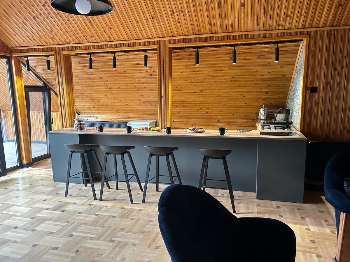 Բորժոմիում գտնվող մեր հմայիչ EcoCottage - ը գտնվում է կանաչ լանդշաֆտում ։ Քոթեջը կառուցված է էկոլոգիապես անվնաս փայտից, ինչը նրան տալիս է բնական տեսք ։ Մեծ պատուհանները թույլ են տալիս արևի առատ լույս ապահովել ՝ կատարյալ տեղ առաջարկելով հանգստանալու համար ։ Քոթեջի ինտերիերը հակադրվում է հողեղեն շրջակայքին ։ Ներս մտնելիս ձեզ դիմավորում է ջերմությունն ու գույնը ։ Այս գույները, որոնք լրացվում են փայտե ճառագայթներով, ստեղծում են լիակատար հարմարավետ մթնոլորտ ։