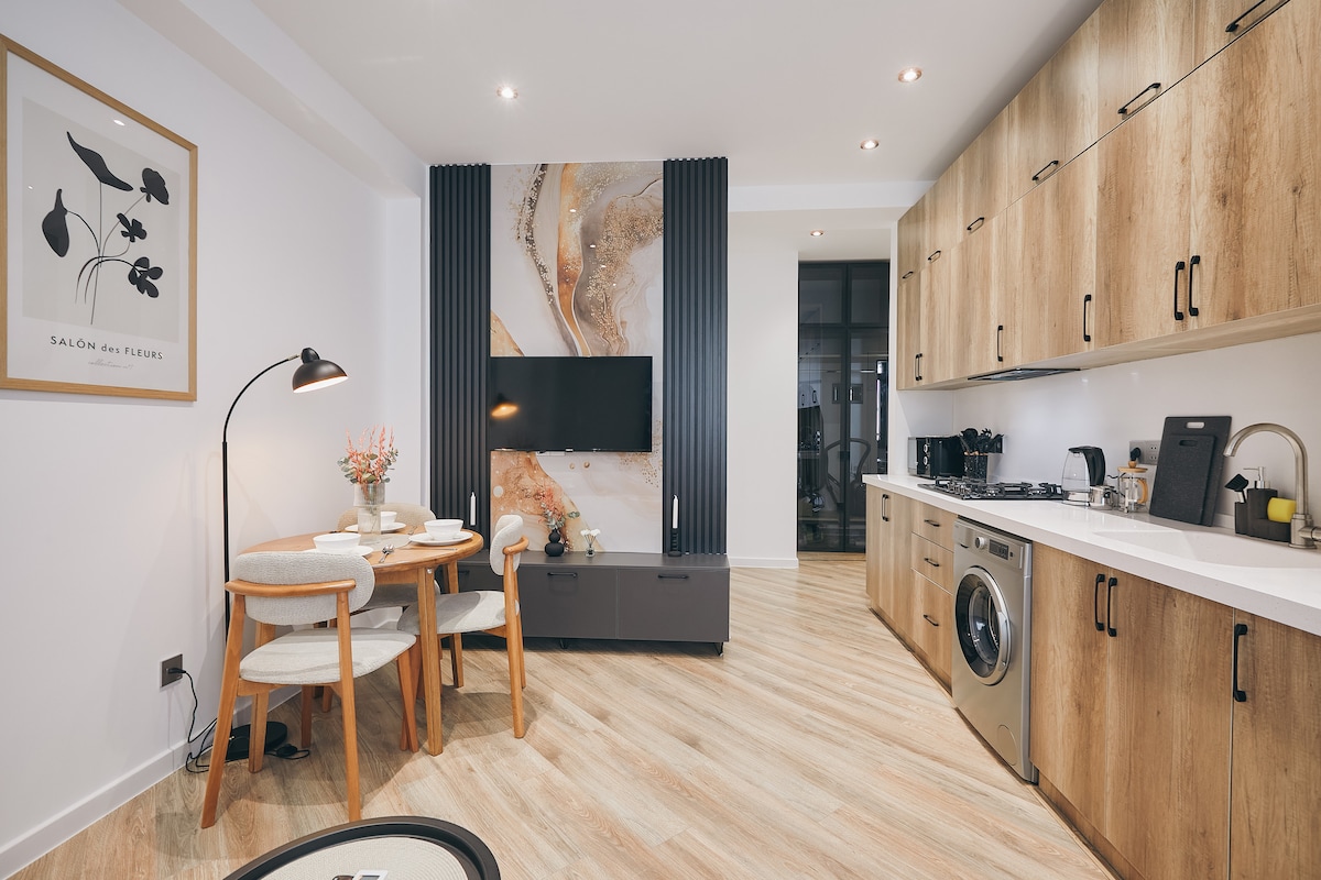 We offer recently renovated modern " Art apartment" in the new building with all the facilities. Apartment created with lots of love and attention to the little things. 1 bedroom with double bed and 1 sofa bed in the living room. Bathroom and kitchen are fully equipped. Comfortably accomodates 4 people. All used materials are high quality. Wall decoration, decorative objects made by hand. Bus stop and subway station are nearby, 3-5 minutes away. You can reach the city center in 7-10 minutes.