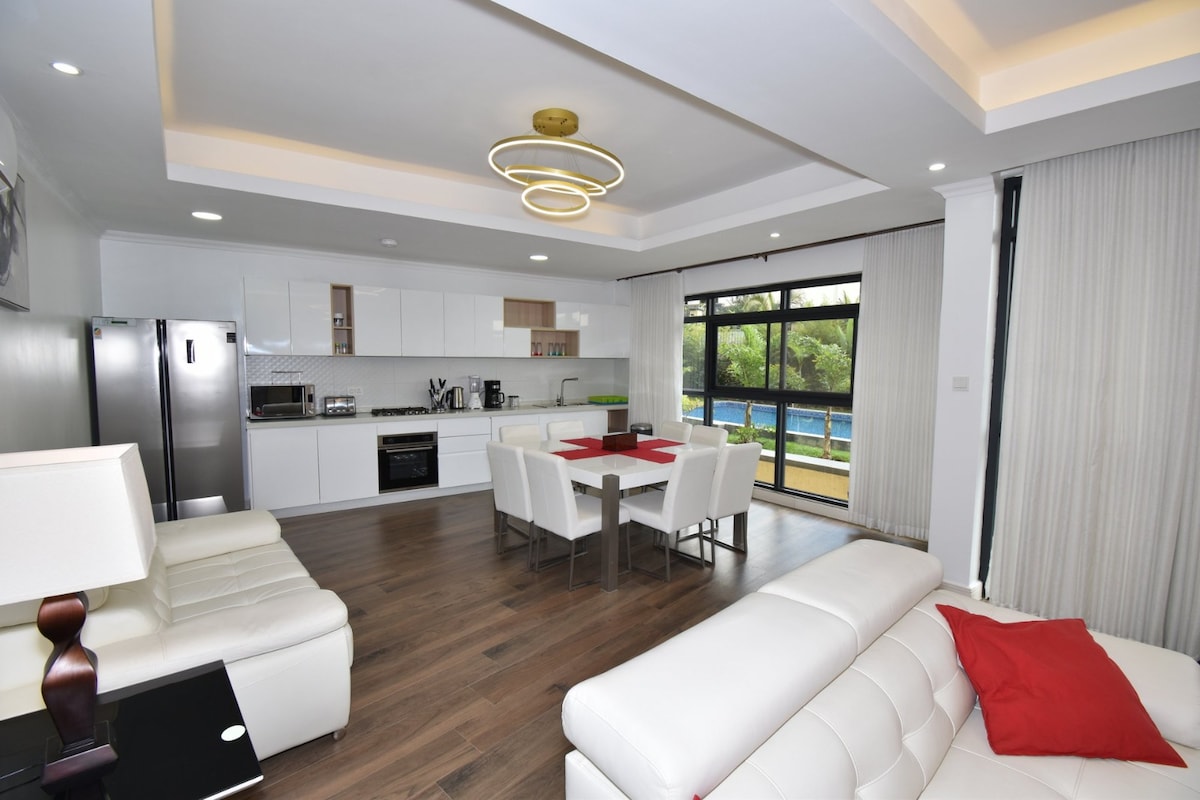 Modern, stylish, air conditioned throughout, newly finished and fully furnished 2 ensuite bedrooms, 2.5 bathroom apartment steps to the golf course. Beautifully furnished with modern contemporary furniture, the space will guarantee a luxurious lifestyle in the best residential neighborhood in Kigali. Some key appliances and fixtures available are: 55" TV screen. Fibre optic internet access Laundry machine Double door refrigerator Inbuilt Oven Inbuilt Dishwasher.