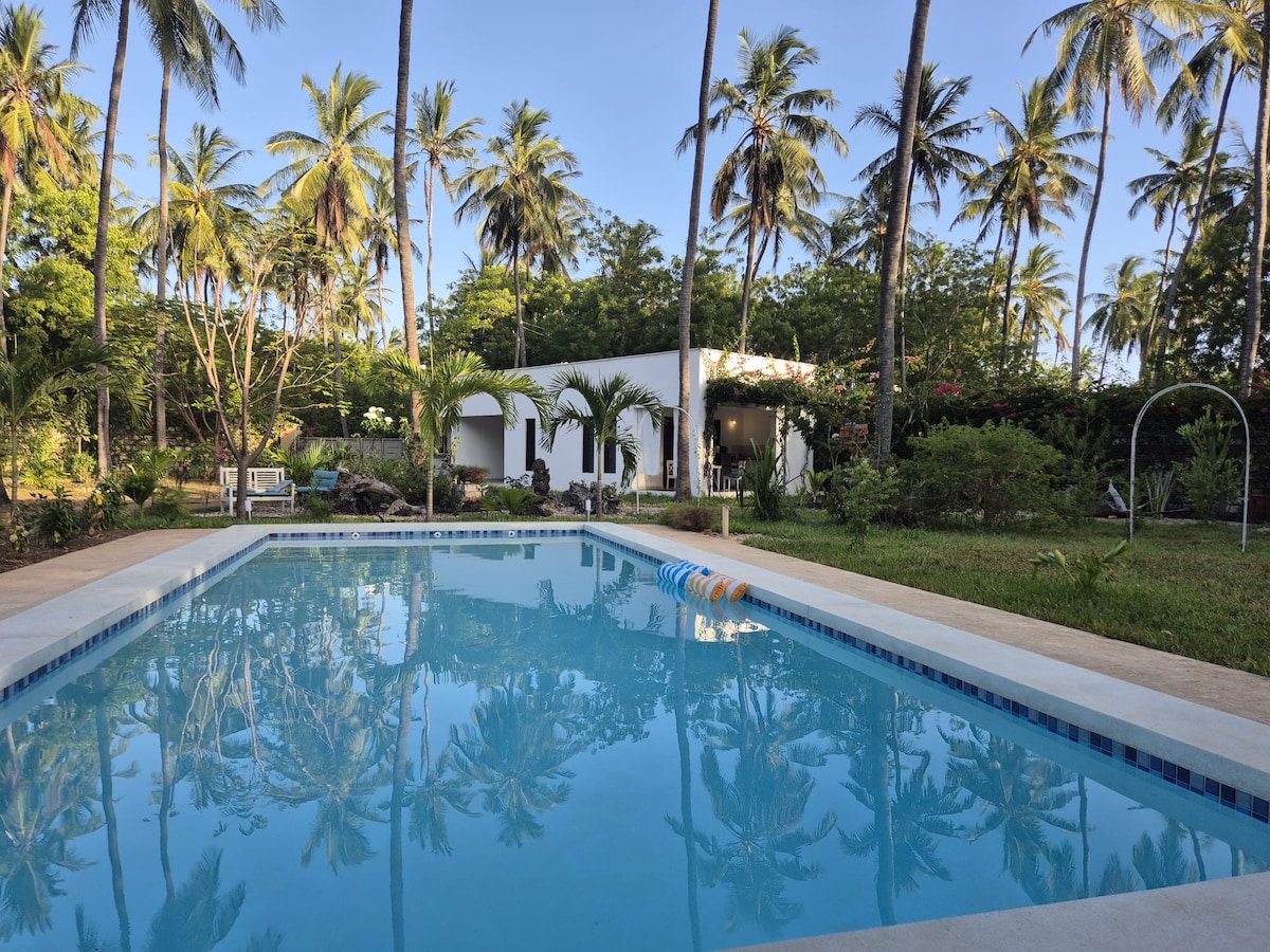 A complete renovation of an old coast cottage into a sparkling new home with large swimming pool. Reclaimed wood & white ‘niru’ (tadelac) with a seasonal through breeze scented with rare mahogany tree wildflowers. Adorned with custom handmade recycled glass throughout the cottage - from lighting to doorknobs. Fully off-grid with ample power & high speed internet and fans throughout. 1 minute walk from the unparalleled Watamu beach on a private access path.