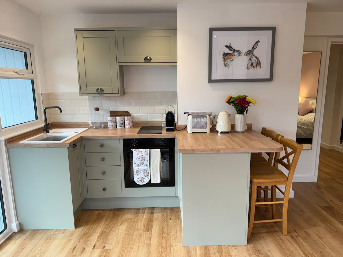 This quaint detached barn is full of character and peace (no WIFI). There is an open plan kitchen/living area with a cosy log burner ( logs available at £7 cash a net) and a slate topped breakfast bar. The property has solid oak flooring throughout except for slate in the bathroom so don’t forget your slippers! The kitchen includes an oven, hob, fridge-freezer, toaster, microwave and kettle. The cosy sitting area opens out onto an attractive patio and grassy area. Sorry no pets