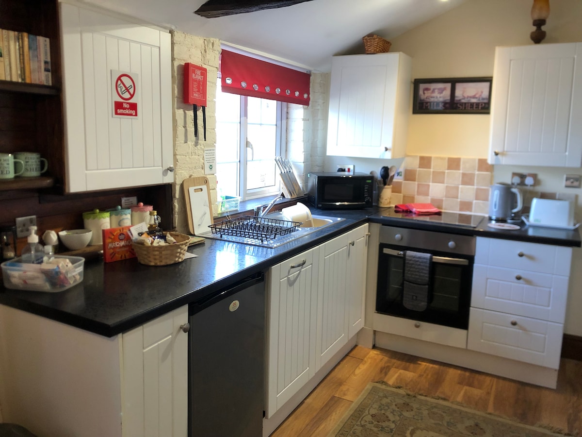 Jasmine is a self contained, ground floor cottage in 18th century farm house adjoining our home. A private front door leads into a fully equipped kitchen. The bedroom has a superking bed (can be twin singles on request) and ensuite shower room. There is a lounge/diner with smart TV and patio door to a 6ft square small private outdoor space ( as well as shared 3 acre field). There is 1 step up to the front door but otherwise the cottage is one level. Travel cot/high chair available on request.