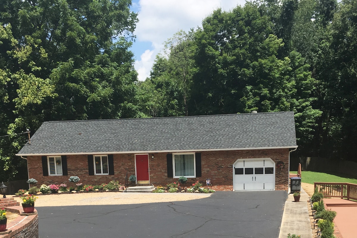 3BR/2BA ONE LEVEL Brick Ranch located next to Bays Mountain 5 mins from downtown Kingsport, W/D, Full Kitchen, 50-inch TV w/cable, WIFI provided. A DOG MUST BE PRE-APPROVED and there will be an added pet fee. Can accommodate up to 6 guests. I do not charge a cleaning fee as long as guest leave place clean as found. Also located on our 6-acre estate is a 2nd BNB rental the "BEARFOOT CHALET" to allow families to be close.