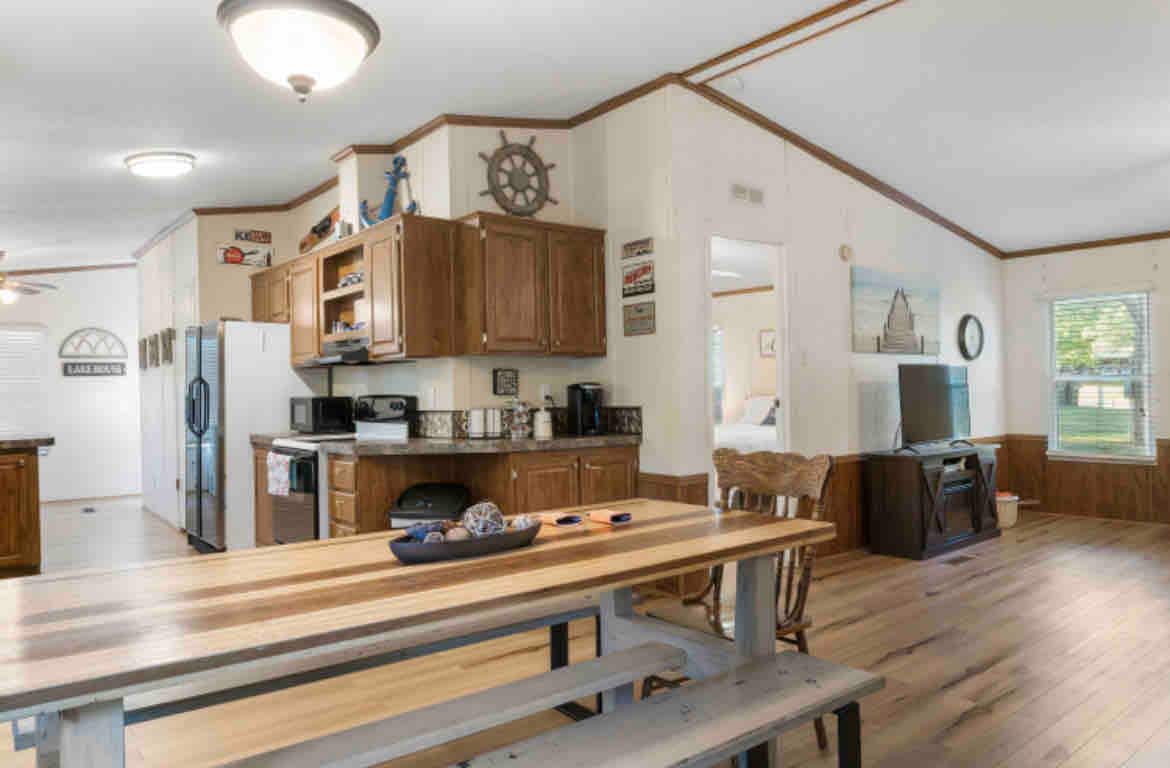Simple Mobile Home with 3 Bedrooms, 2 Bathrooms, Large Den with a pool table & covered parking a few minutes from Lake Texoma. This home has everything you need to keep you & your family comfy while visiting Lake Texoma. Our little town has several delicious places to dine or stoke up the grill in the back patio area. 5G internet, Roku TV plus a variety of movies for all ages. NO Pets Allowed! NO Smoking/VAPING! NOT Responsible for injuries or accidents! NO cleaning fish inside the home!