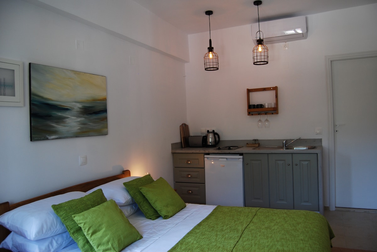 Սա քարե ստուդիա է լողափից ընդամենը մի քանի րոպե հեռավորության վրա ։ Թեև այն գտնվում է Կիոնի նավահանգստից ՝ Իոնյան ամենասիրված և գեղեցիկ նավահանգիստներից մեկից, մյուս կողմից կարճ հեռավորության վրա, դուք կհայտնվեք գյուղական վայրում, որտեղ ֆերմերները պահում են իրենց կենդանիներին և հողը հավաքում ձիթապտղի ծառերով: Դա հակասություն է, բայց այստեղ հանդիպում են երկու հակասող ապրելակերպ ։ Ջերմ ընդունելություն է սպասվում ձեզ ՝ բարձրորակ արտադրանքներով, Իթական հողի նվերներով ։