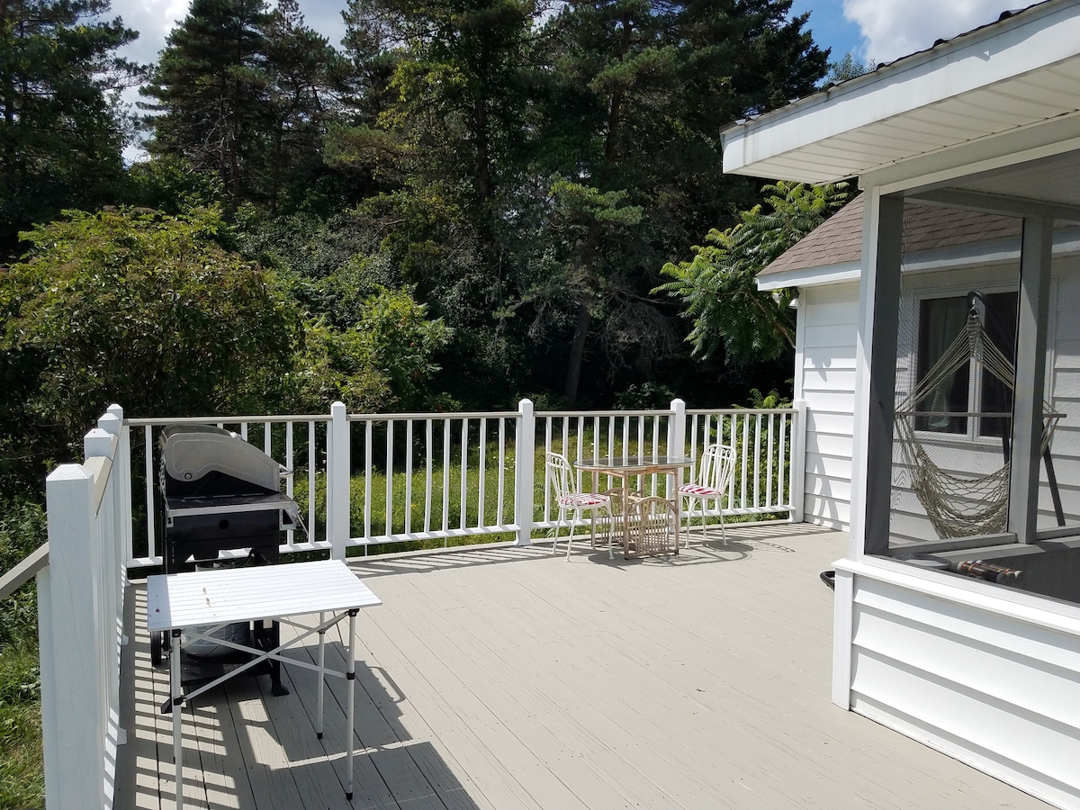 Our homestead, Misty Isle Acres, is our little imperfect oasis, nestled within the beautiful Helderberg hilltowns of Albany county. Our in-law apartment contains a bedroom, full bathroom, and living room with TV (inc. Netflix & Disney+), DVD player, and futon. There is an enclosed porch and deck, complete with tables, chairs, and grill. We also have a large pond and woods to explore. Please note, this is a working homestead; the grass isn't always mowed and sometimes there are animal smells.