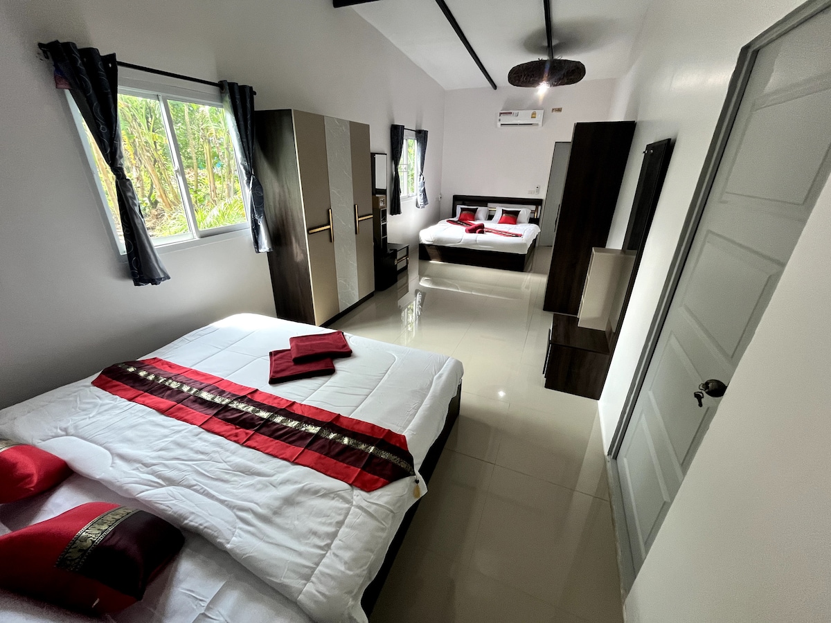 Grande chambre pour 4 personnes avec deux lits king size, air conditionné, salle de bains privative, espace extérieur disponible pour prendre vos repas. Chambre au calme. Chambre à 300m de la mer (de la plage de Kai Bai à Koh chang) à pied. Proche de toutes commodités, location scooter, Seven eleven...