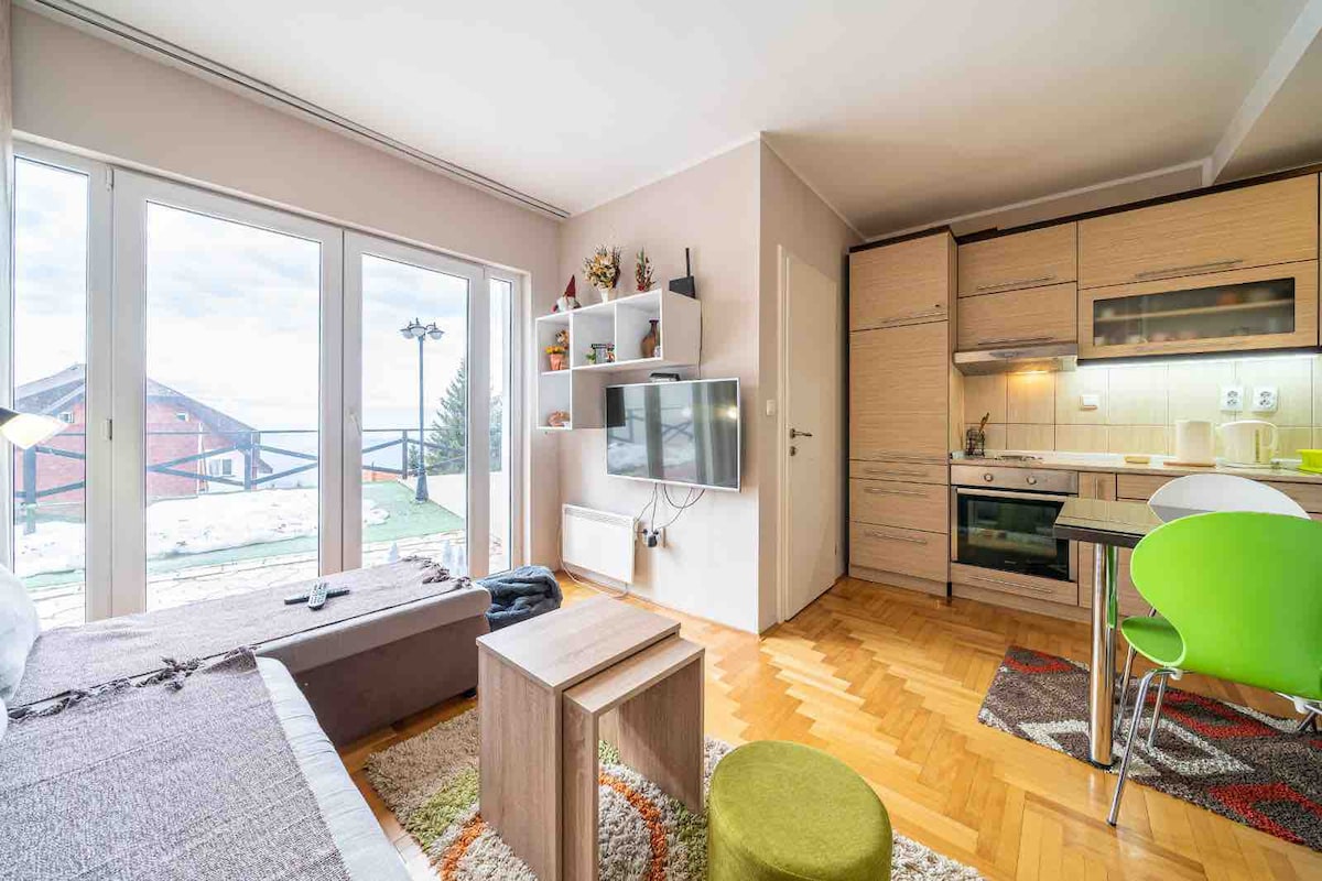 Sun facing,at1500m elevation,brand new apartment,decorated in lovely mountain style with astonishing mountain view.Only 2km from closest skiing lane,in quiet neighborhood with wonderful mountain view & evergreen forest around. Fully pawed road with public lights connecting it to main road. Grocery shops, hotels and restaurants are in close walking distance. No stairs and no uphill/downhill walking is required to reach your warm and comfy apartment from private parking just in front of the house.