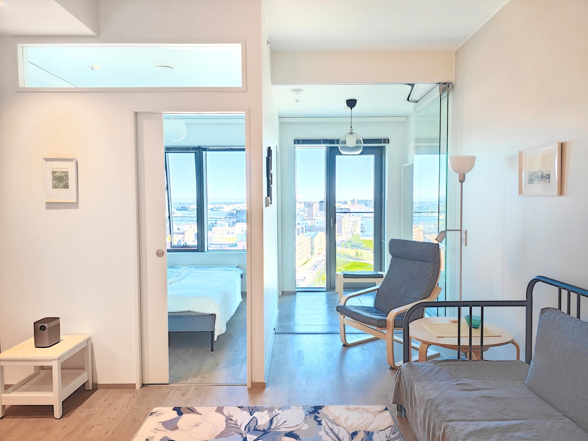 Պատուհան և պատշգամբ դեպի հարավ, հիանալի տեսարան դեպի ծով և Հելսինկիի կենտրոն Հարմար է տեղական և միջազգային ուղևորների համար, 4 - րդ մետրոյի կանգառ/6 րոպե կենտրոնական երկաթուղային/մետրոյի կայարանից 65 դյույմ QLED հեռուստացույց, PC +1000MWi - FI, 34 դյույմ խաղային էկրան+ադապտեր Բնակարանը Ֆինլանդիայի ամենաբարձր բազմաֆունկցիոնալ շենքի աշտարակի վրա է, Կալասատամա մետրոյի կայարանի/Ռեդի առևտրի կենտրոնի վերևում (ուղղակի վերելակ)՝ ռեստորաններով, բրենդային խանութներով և ժամանցի ծառայություններով, հիանալի է հանգստի/գործնական ուղևորության համար՝ առավելագույնը 3 անձի համար