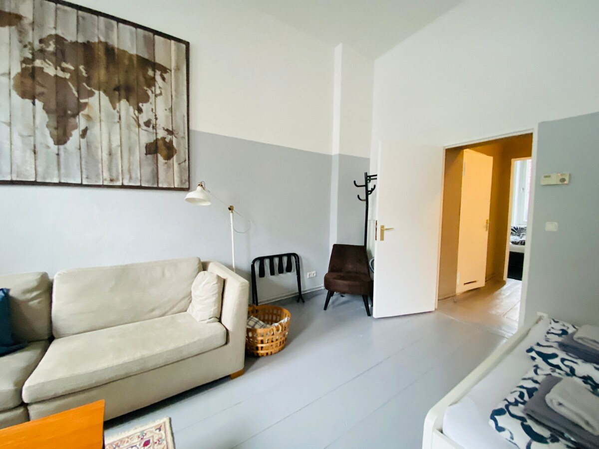 Truly charming and original Berlin neighbourhood: SCHILLERKIEZ. In the most sought for district NEUKÖLLN, close to giiiiiiigantic new recreational park on former airport TEMPELHOF (THF). INCLUSICE CLEANING FEE. Surrounded by many vivid little restaurants of various international cuisines, hipp bars and old-Berlin pubs. Supermarket one block, LIDL two blocks away. Subway stations of line U8 BODDINSTRASSE and LEINESTRASSE within walking distance and 7 stops to ALEXANDERPLATZ (12 mins).