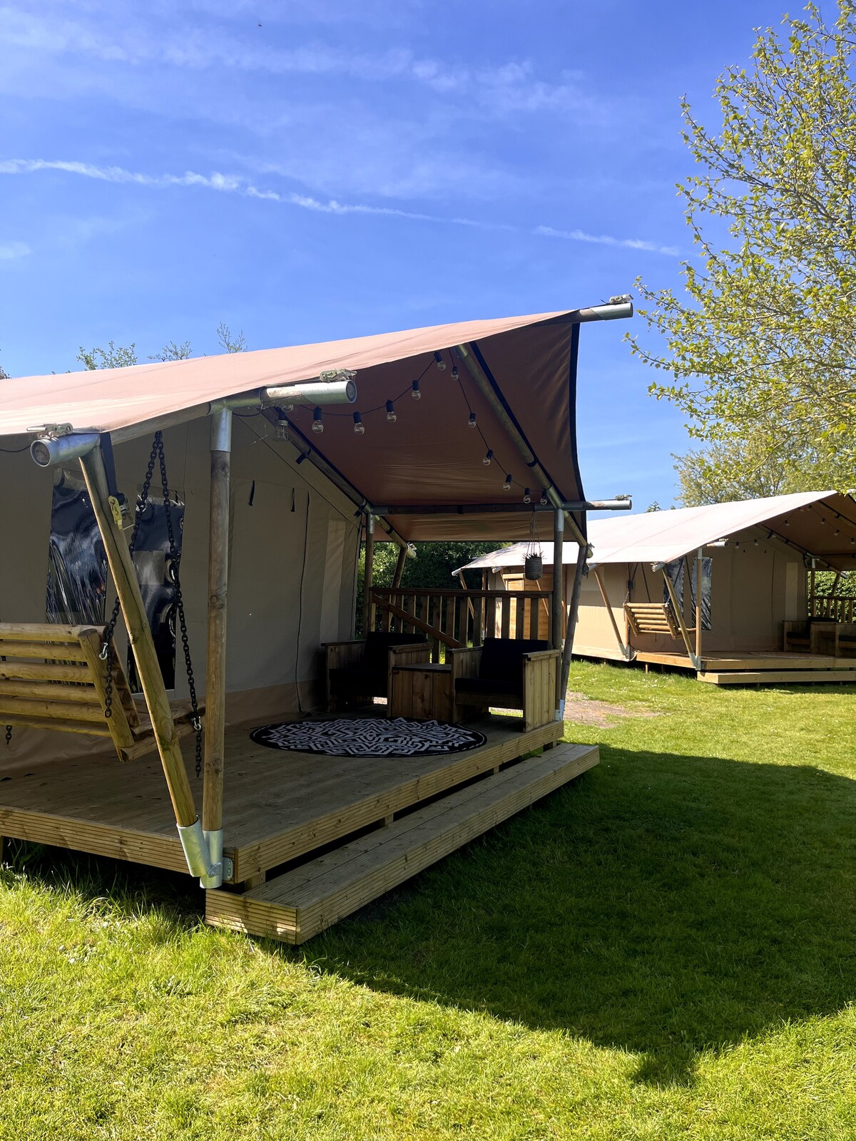 Մեր սաֆարի վրաններում դուք կզգաք քեմփինգը հարմարավետ ձևով. հարմարավետությունն ու դրսի հրաշալի լինելը, բայց վրանում, որը հագեցած է (գրեթե) բոլոր հարմարություններով: Մեր 6 սաֆարիի վրանները գտնվում են մարգագետնում ՝ Ռոուզենդալի ծայրամասերում, հանգիստ ճանապարհի վրա: Վրաններն ունեն իրենց առանձին լոգասենյակը և խոհանոցը: Մենք ունենք մեծ բատուտ, ճոճանակներ, խաղահրապարակ, խաղահրապարակ և կենդանիների մարգագետիններ ՝ այծերով, նապաստակներով և հավերով: Բակում կարող եք կայանել մոտակայքում ։