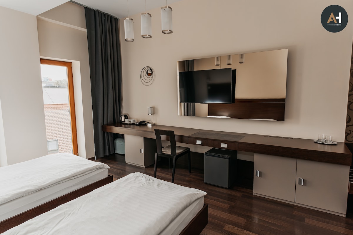 Elegantná hotelová izba v historickom hoteli Zlatý Dukát priamo v centre Košíc. Kombinuje atmosféru starého mesta s moderným komfortom a hotelovou čistotou. Len pár krokov od Hlavnej ulice, pamiatok, reštaurácií a kaviarní, no zároveň tiché miesto na oddych alebo prácu. Ideálne pre páry aj business cestujúcich, ktorí chcú bývať priamo v srdci mesta.