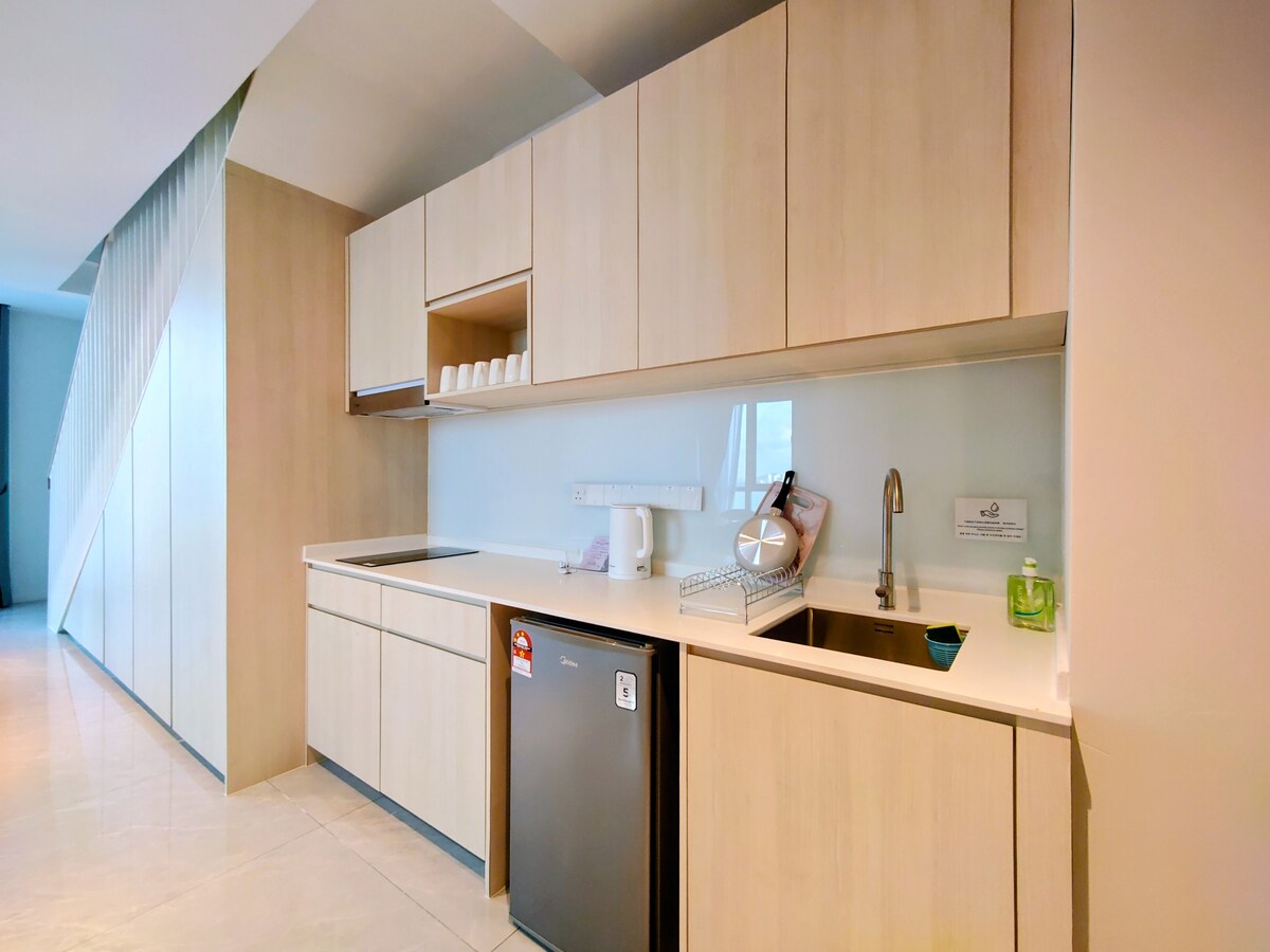 💡 For safety reasons, iron is not provided, but a garment steamer is available upon request 🌿 26F Studio with Balcony A 1BR apartment offering a limited greenery view. Key Features: 🛏️ Sleeping Area: 1 queen + 1 single bed, open rack 🚿 Bathroom: Private ensuite 🛋️ Living Space: Sofa, 2-seater dining table, smart TV 🍳 Kitchenette: Essential cookware & cutlery included 💇 Amenity: Hairdryer provided