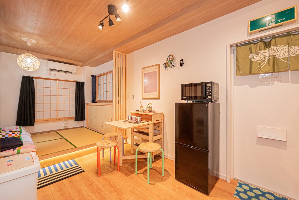 このリスティングは、ご家族や仲間と中長期の滞在を楽しむ拠点に向いています。 都心に近い静かな住宅エリアにある2023年オープンのアパートメントホテルです。周辺には水辺、公園、神社があります。 35㎡の広々とした室内は、日本風デザインです。1台のクイーンベッド、3つの布団があり、大人5人まで泊まれます。(2歳未満乳幼児の添い寝は無料です。) 自炊のできるコンパクトキッチン、全自動の洗濯乾燥機、広々としたサイズのバスルーム、独立したトイレがあります。 アンドロイドTVやフリーWi-Fiの環境も整備されていますので、室内で過ごしたりお仕事をするにも充分な環境です。 ゲストに開放されたルーフトップでリラックスすることもできます。 チェックインは、タブレットを使う無人のチェックインシステムですので、深夜でも気兼ねすることはありません。ドアは最新式のタッチキーシステムで管理されています。 最寄りの駅(住吉駅・半蔵門線・都営新宿線)の出口から徒歩5分の場所にあり、近くにはスーパーマーケットなどがあります。 こちらの落ち着いた宿泊先で、ご家族一緒におくつろぎください。