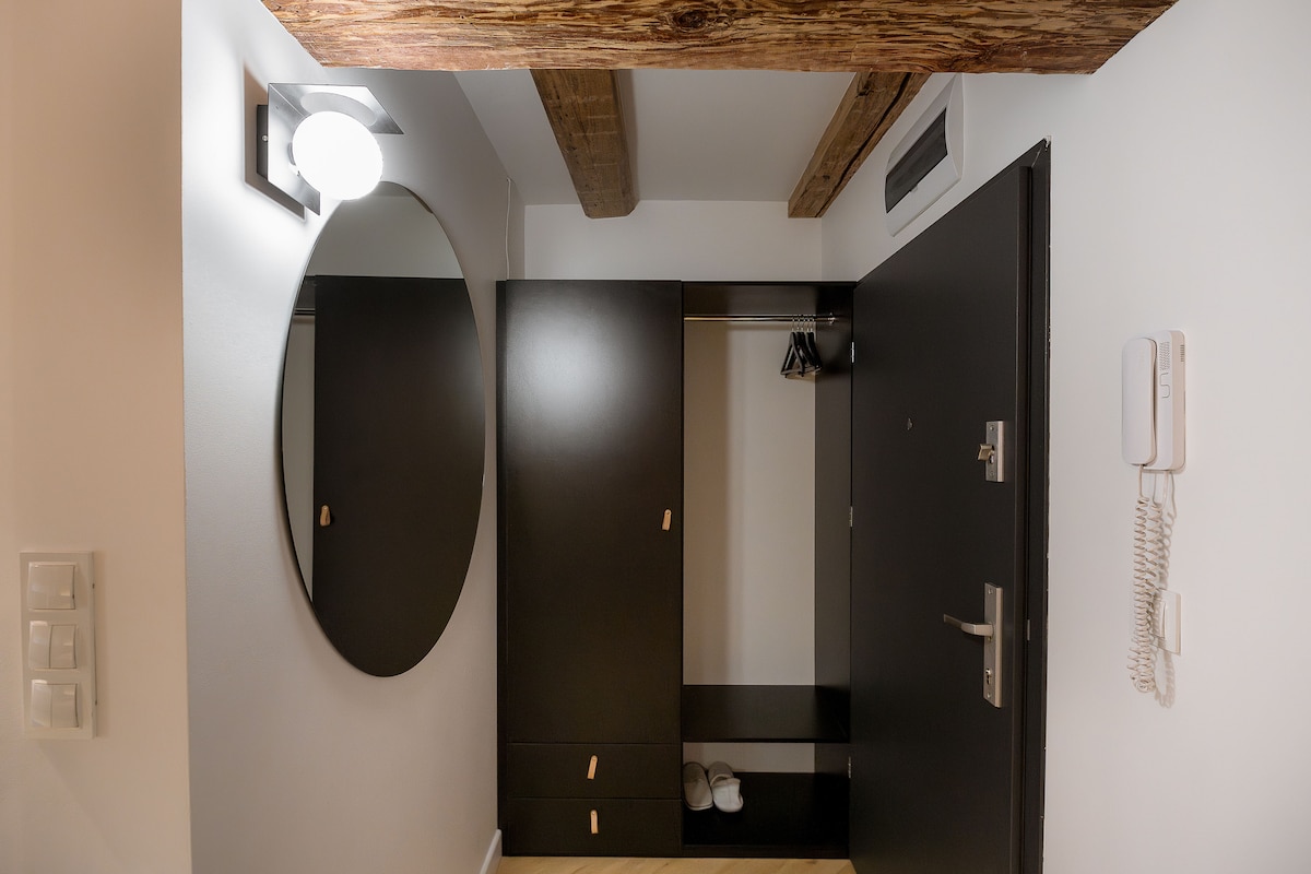 Dwupoziomowy apartament z tarasem w centrum malowniczej Toruńskiej Starówki. Projekt tego miejsca nawiązuje do historii związanej z życiem Mikołaja Kopernika. Jest tu połączenie nowoczesności i elegancji ze średniowiecznym charakterem domu. Mieszkanie pomimo centralnej lokalizacji, jest bardzo ciche, ponieważ okna nie wychodzą na główna ulicę. Czyni to je miejscem idealnym na relaks i ucieczkę od zgiełku bez wychodzenia ze Starego Miasta. Taras na dachu jest wyjątkowym atutem tego mieszkania.