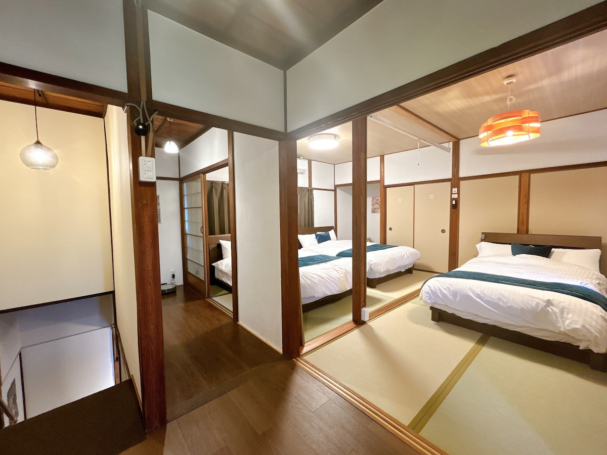 Restored historical 100+ year old Traditional Japanese style home. 20% discount offered on multiple day stays. All 3 bedrooms are tatami mat with Futon bedding. 1 BR on the 1st fl. with a garden view that historically, had been used as a waiting place for tea ceremony guests. There is a kitchen/dining area and a full-Bath with western amenities and use of a washing machine on the 1st fl. The 2nd Floor provides 2 adjoining BR separated by shoji screen doors and also includes a half-bath.