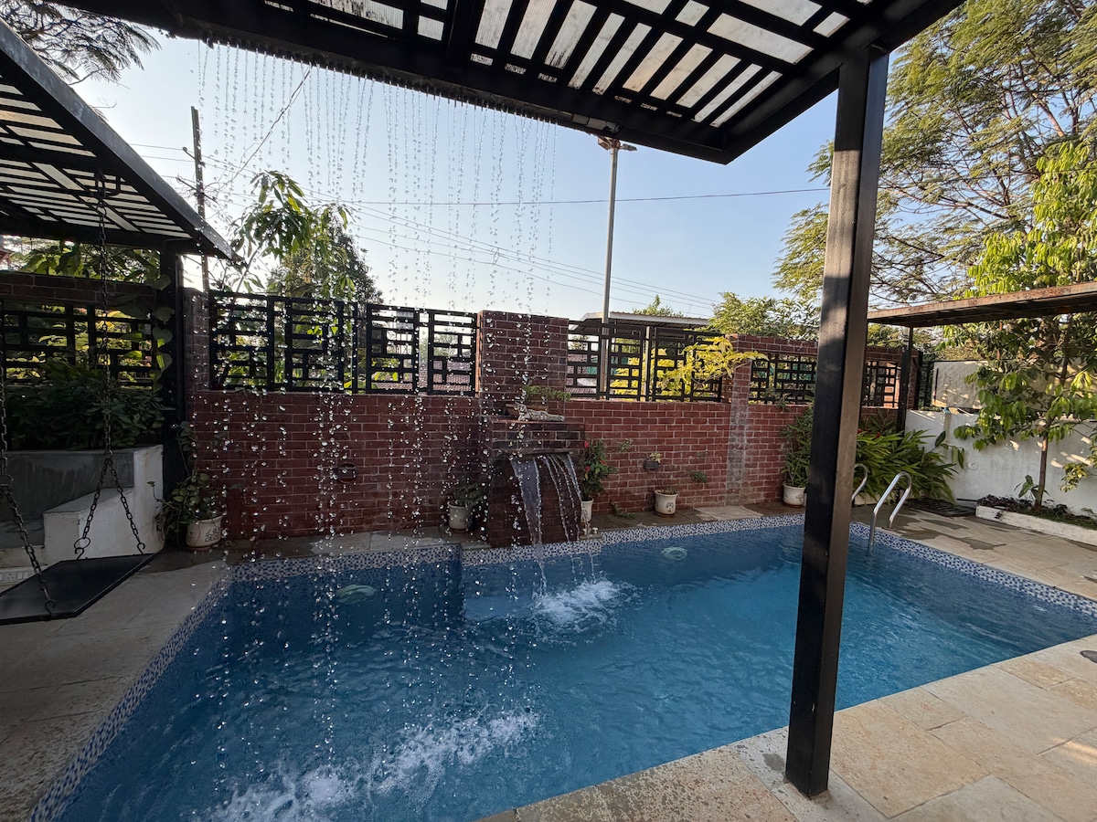 Windsor Home - Great Escape’s first offering of a Bungalow. The mesmerizing property are designed to elevate the energy of the home and provide our guests with an extraordinary stay! The bedrooms are equipped with all comforts for you, to ensure a seamless stay. As a group, you’d never want to leave the poolside with a view of the lawn, but if at all you do, you can hang out in the gazebo set up on the lawn and bask in the vibe of it all. Best hideaway from the city.