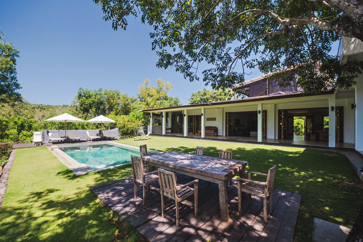 Discover many surprising ways to unwind in this self-contained Villa Bungalow within our sprawling estate. Wander lush gardens, sway in a vintage-style tandem swing, or relax by the natural stone pool. Soak in a designer tub or choose a book that tickles your fancy and relax on the breezy patio/veranda daybed. Your King Bed is like sleeping on a cloud. Also included: - Separate kitchen - Daily maid/housekeeping service - Up to 150mbps Wifi - 8-10 min walk to the beach - Peaceful, quiet